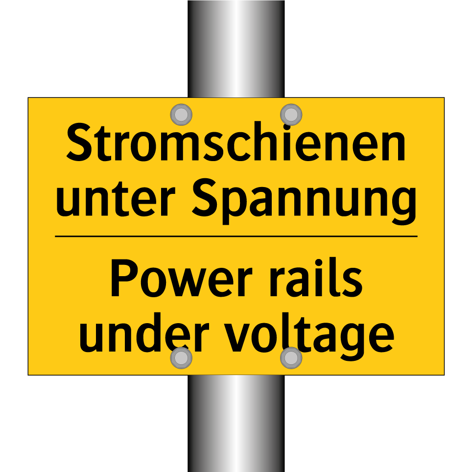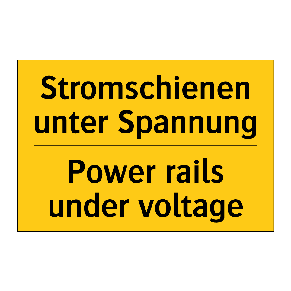 Zweisprachiges Warnschild mit deutschem Text Stromschienen unter Spannung und englischem Text Power rails under voltage
