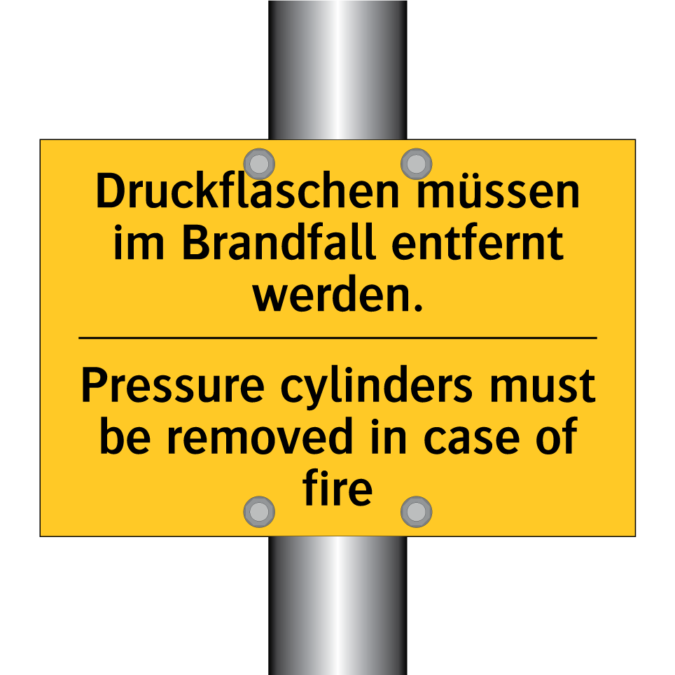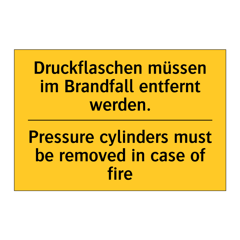 Zweisprachiges Warnschild mit deutschem Text Druckflaschen müssen im Brandfall entfernt werden. und englischem Text Pressure cylinders must be removed in case of fire