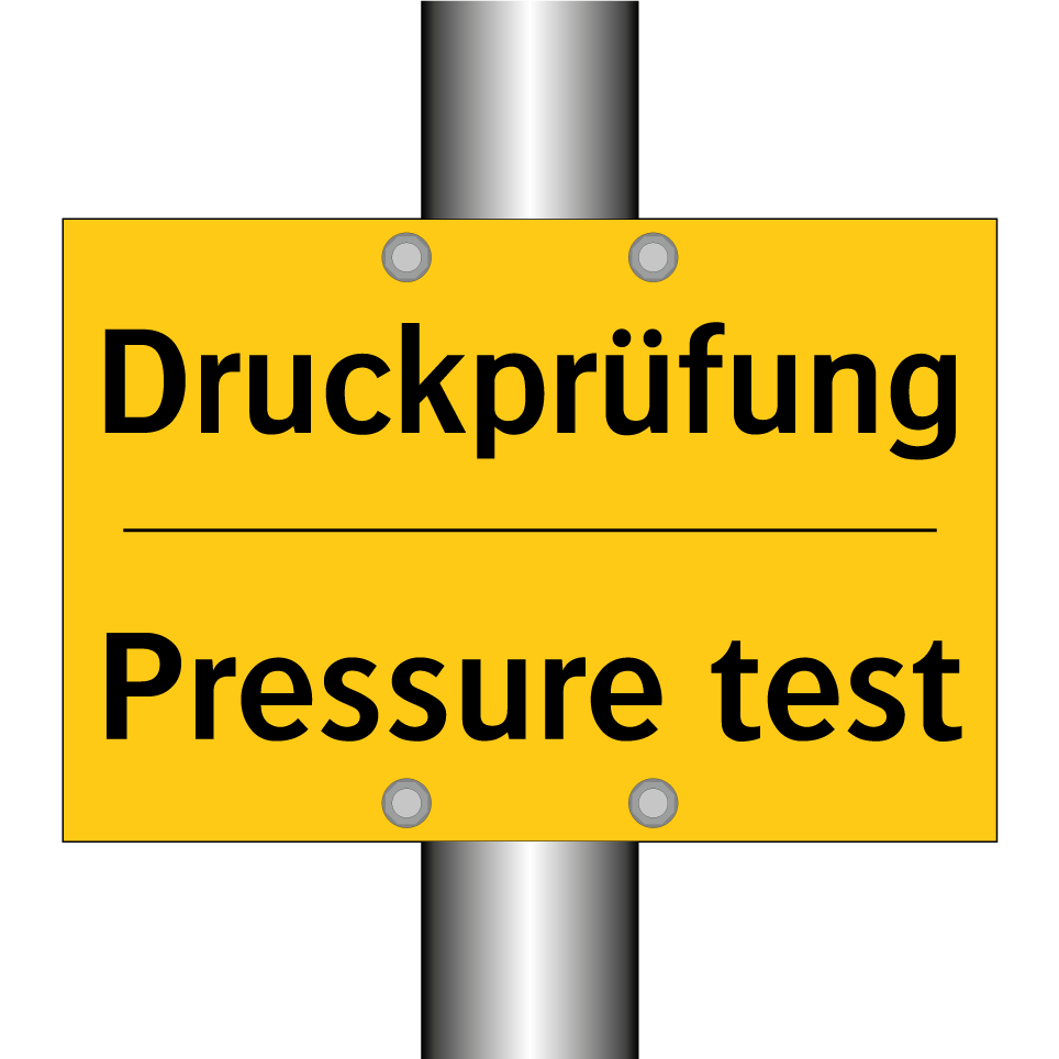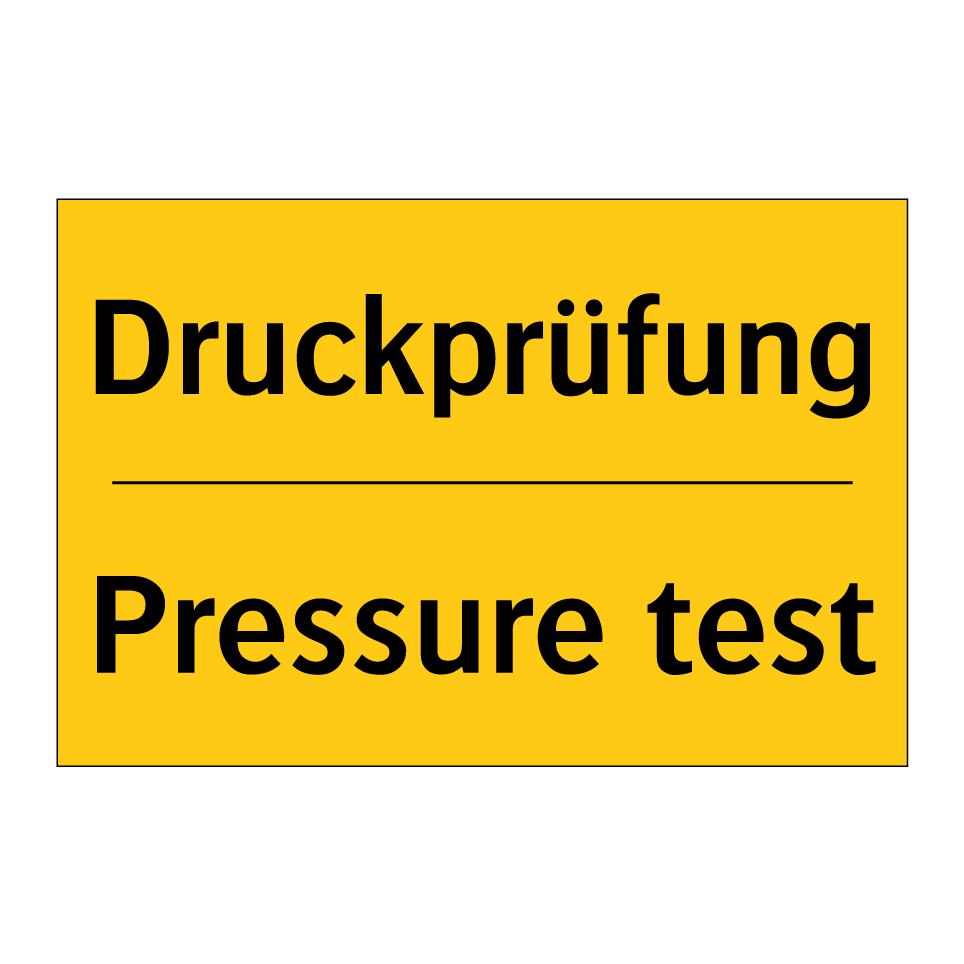 Zweisprachiges Warnschild mit deutschem Text Druckprüfung und englischem Text Pressure test
