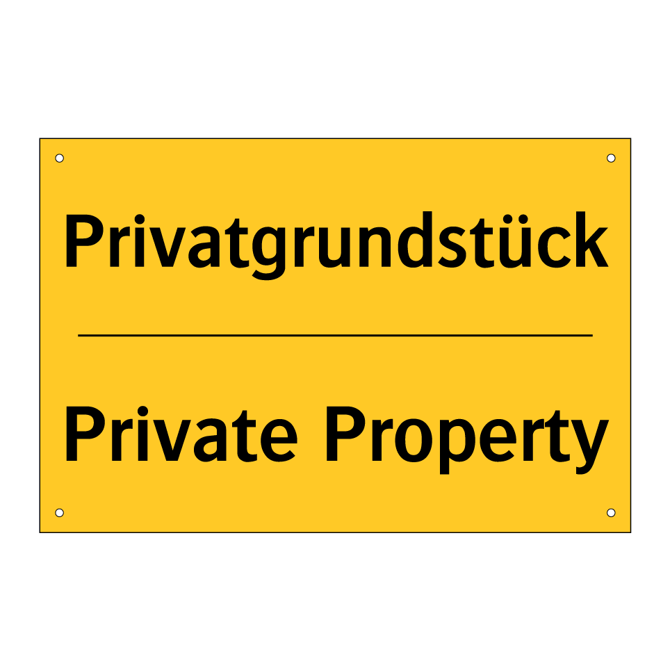 Zweisprachiges Warnschild mit deutschem Text Privatgrundstück und englischem Text Private Property