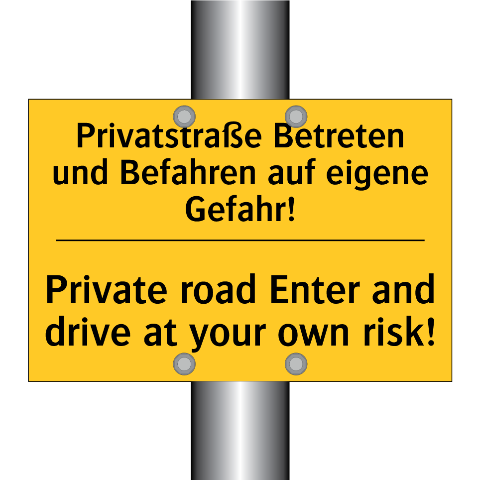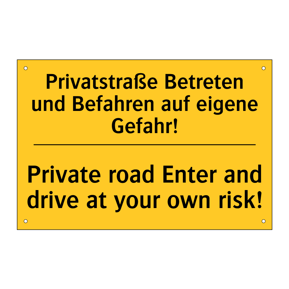 Zweisprachiges Warnschild mit deutschem Text Privatstraße Betreten und Befahren auf eigene Gefahr! und englischem Text Private road Enter and drive at your own risk!