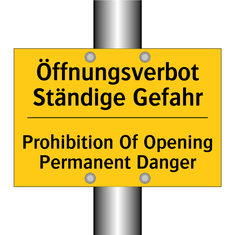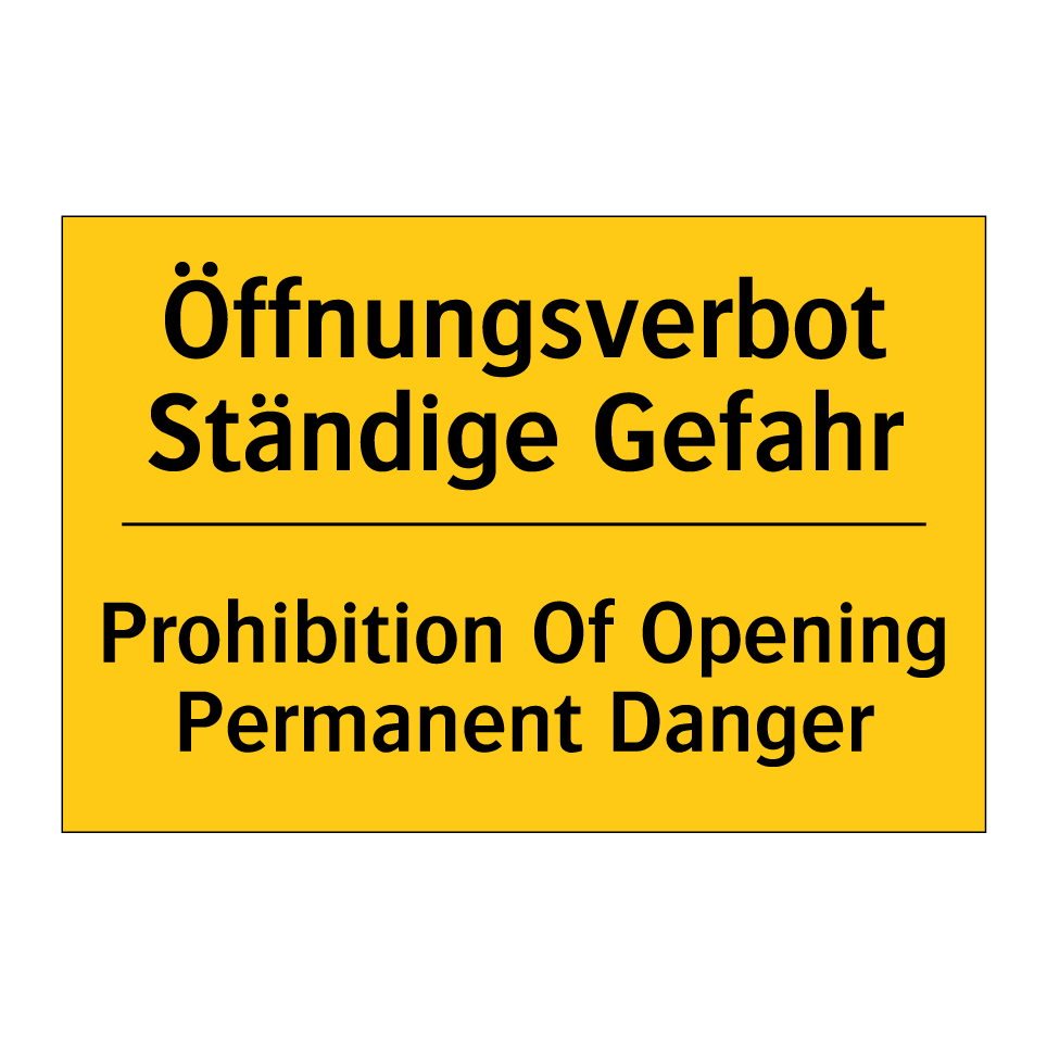 Zweisprachiges Warnschild mit deutschem Text Öffnungsverbot Ständige Gefahr und englischem Text Prohibition Of Opening Permanent Danger
