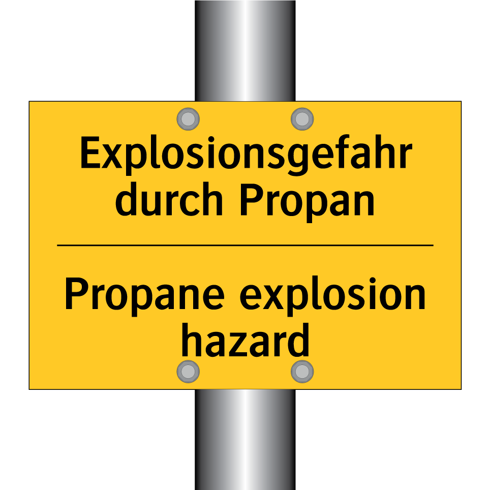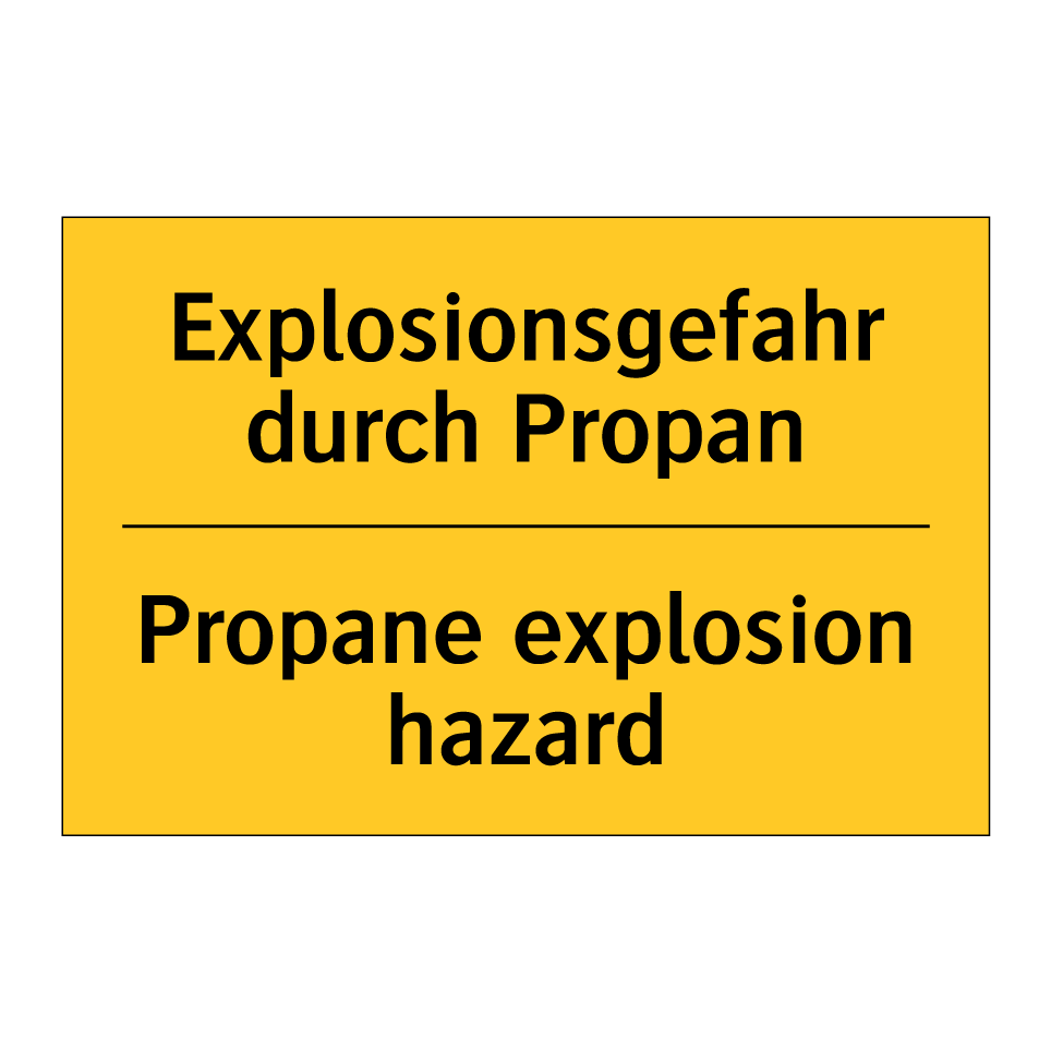 Zweisprachiges Warnschild mit deutschem Text Explosionsgefahr durch Propan und englischem Text Propane explosion hazard