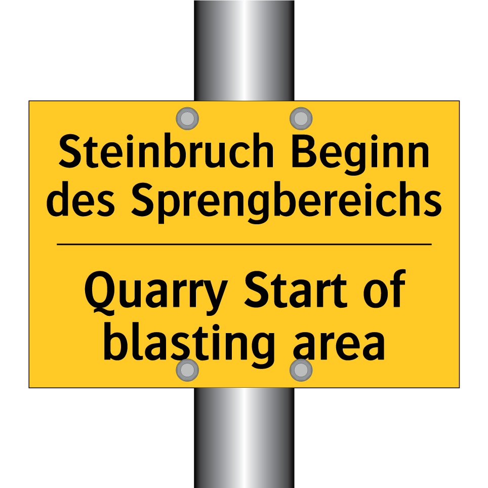 Zweisprachiges Warnschild mit deutschem Text Steinbruch Beginn des Sprengbereichs und englischem Text Quarry Start of blasting area