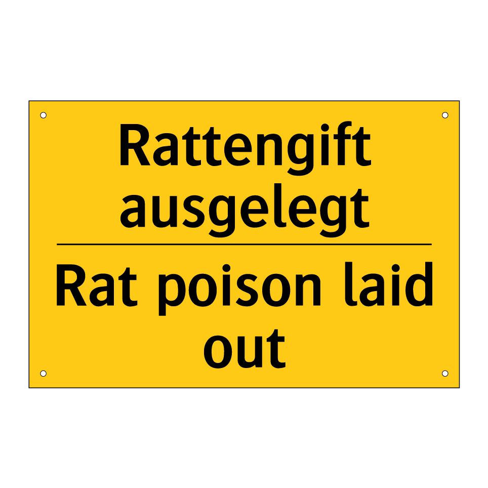 Zweisprachiges Warnschild mit deutschem Text Rattengift ausgelegt und englischem Text Rat poison laid out