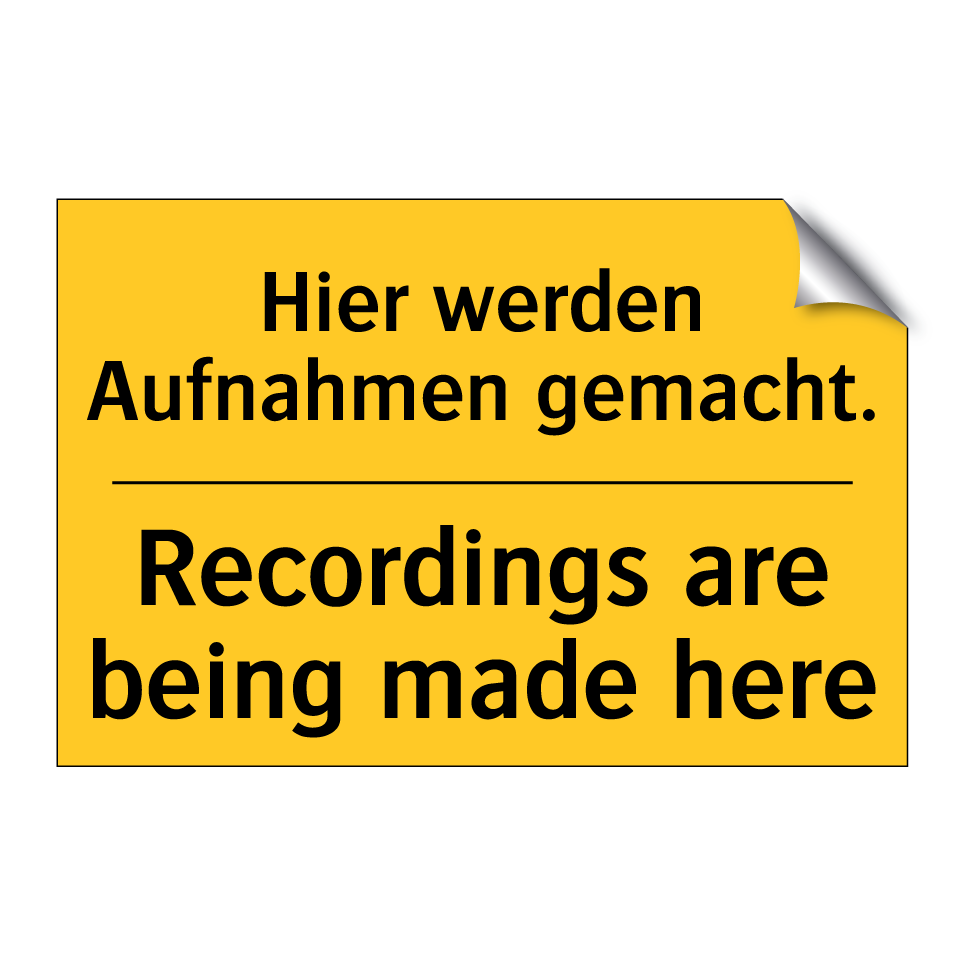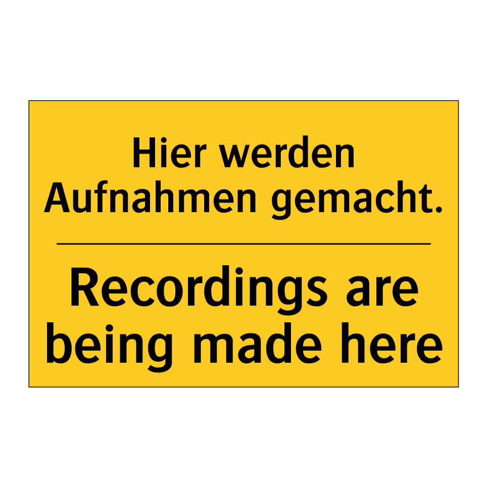 Zweisprachiges Warnschild mit deutschem Text Hier werden Aufnahmen gemacht. und englischem Text Recordings are being made here