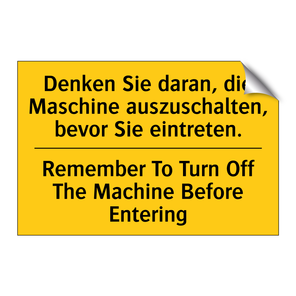 Zweisprachiges Warnschild mit deutschem Text Denken Sie daran, die Maschine auszuschalten, bevor Sie eintreten. und englischem Text Remember To Turn Off The Machine Before Entering