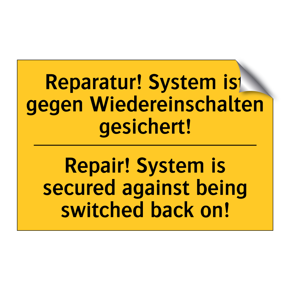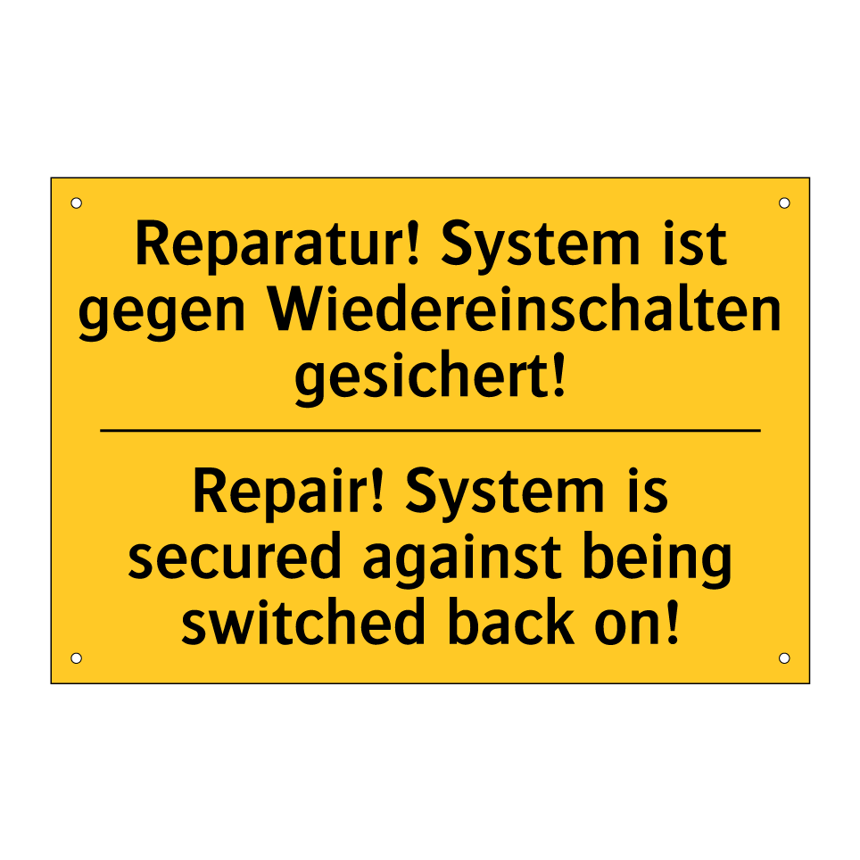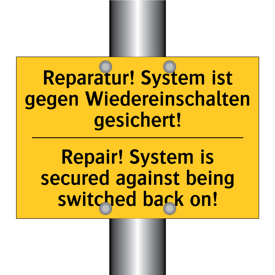 Zweisprachiges Warnschild mit deutschem Text Reparatur! System ist gegen Wiedereinschalten gesichert! und englischem Text Repair! System is secured against being switched back on!