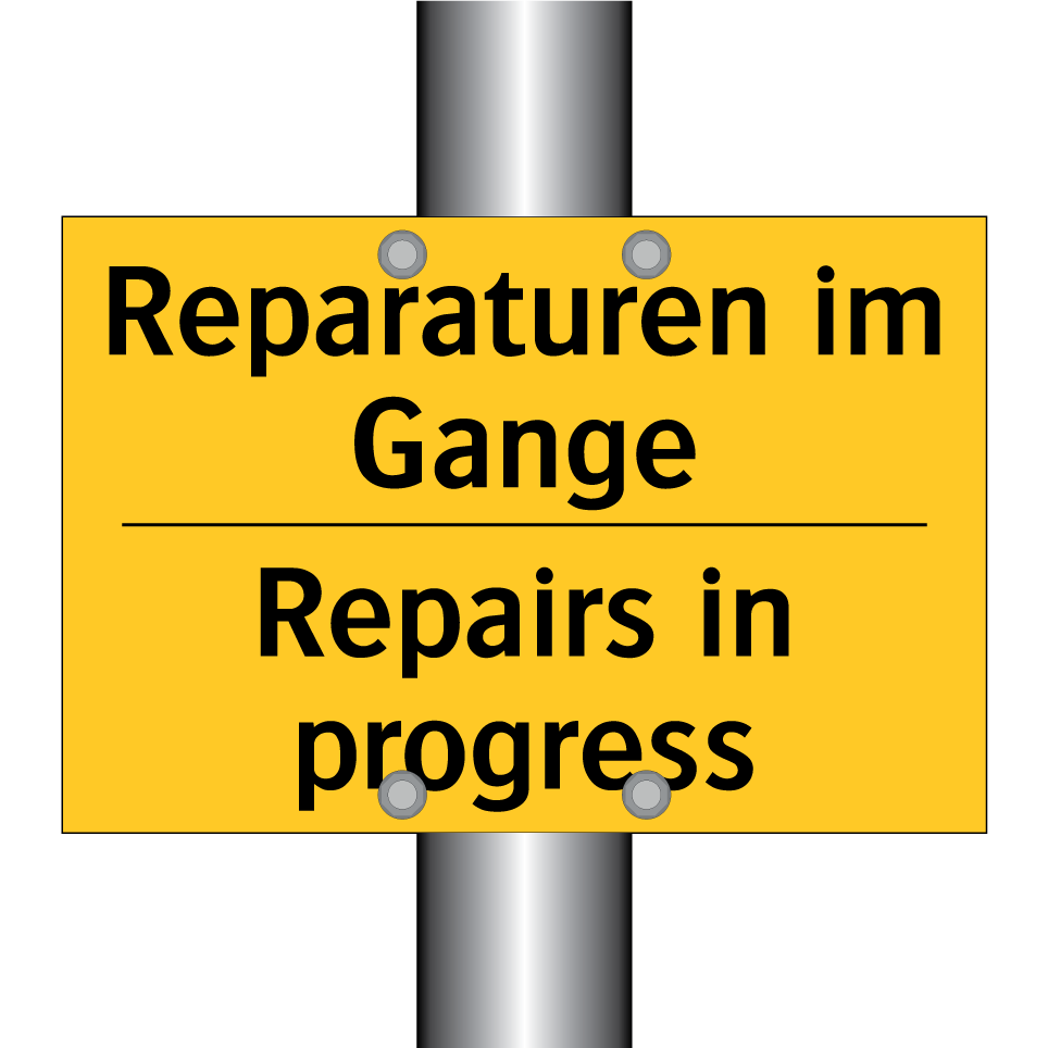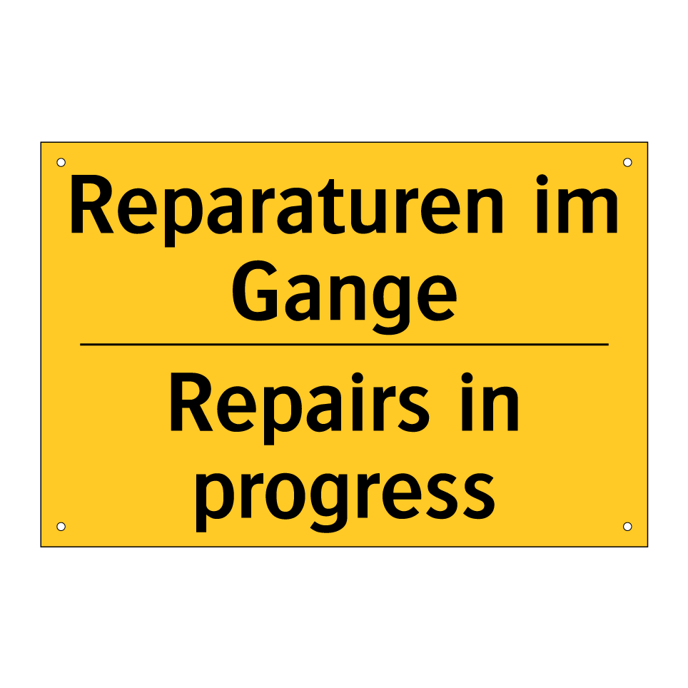Zweisprachiges Warnschild mit deutschem Text Reparaturen im Gange und englischem Text Repairs in progress
