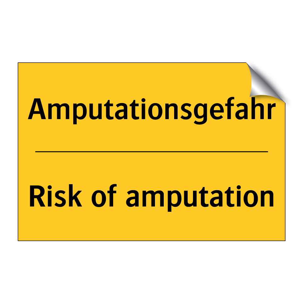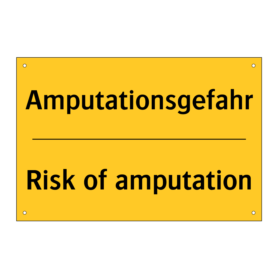 Zweisprachiges Warnschild mit deutschem Text Amputationsgefahr und englischem Text Risk of amputation