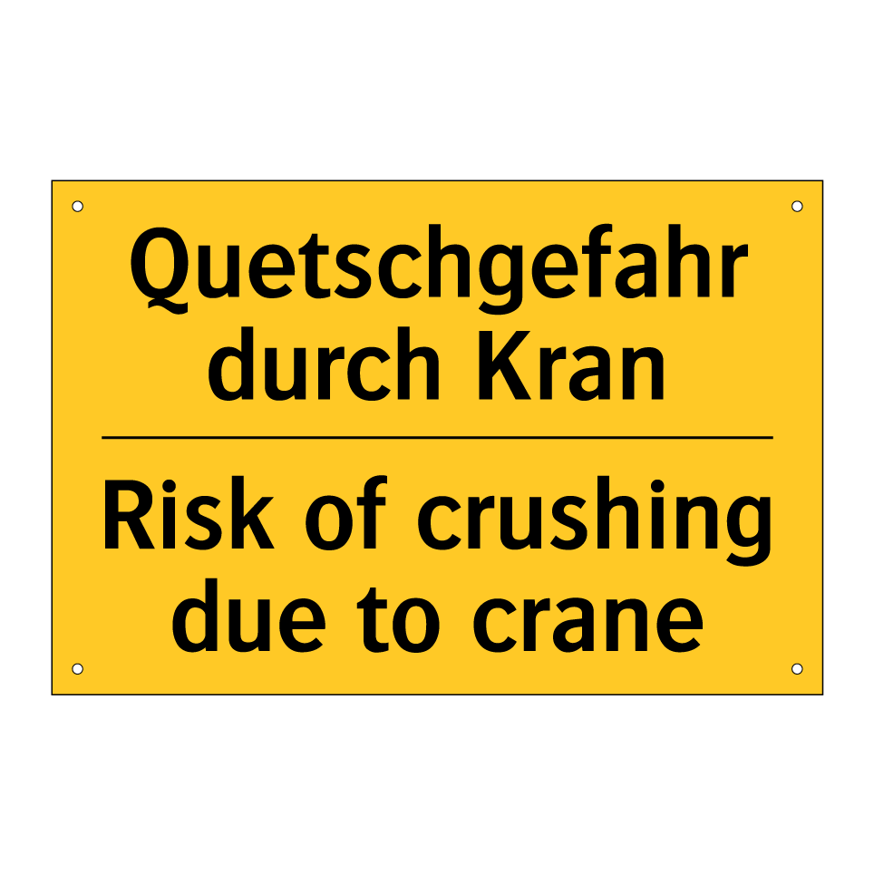 Zweisprachiges Warnschild mit deutschem Text Quetschgefahr durch Kran und englischem Text Risk of crushing due to crane