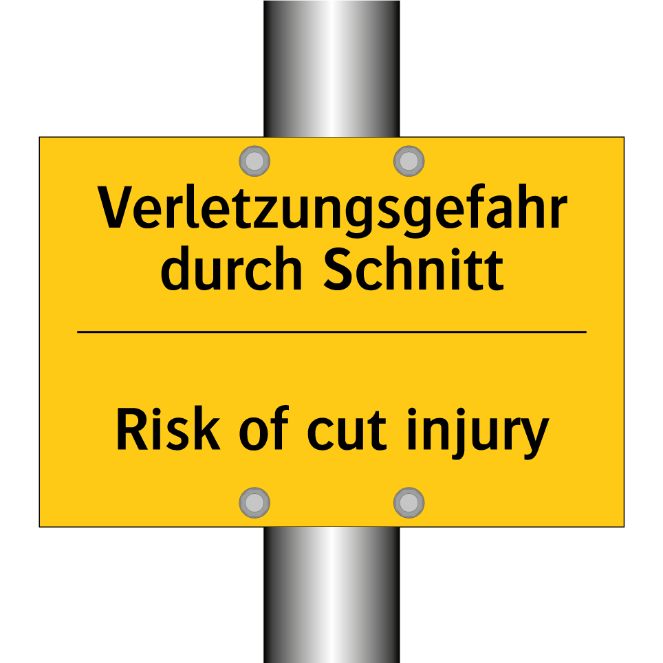 Zweisprachiges Warnschild mit deutschem Text Verletzungsgefahr durch Schnitt und englischem Text Risk of cut injury