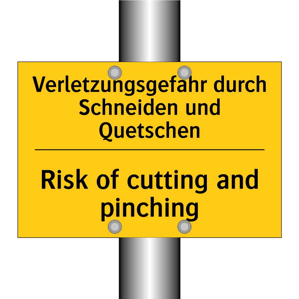 Zweisprachiges Warnschild mit deutschem Text Verletzungsgefahr durch Schneiden und Quetschen und englischem Text Risk of cutting and pinching