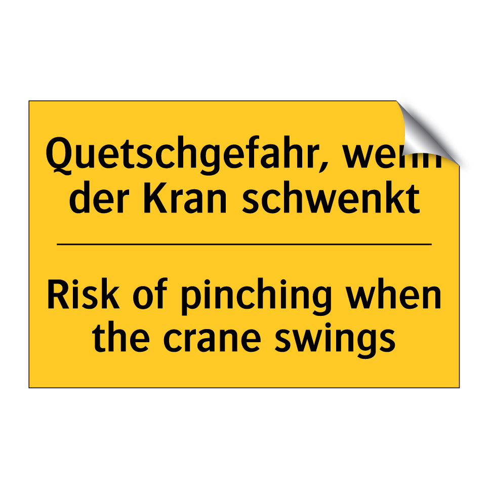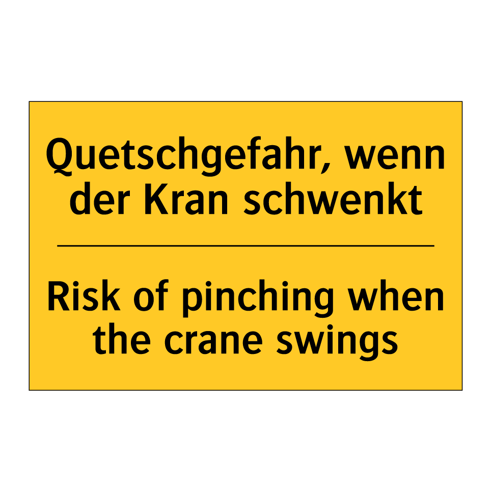 Zweisprachiges Warnschild mit deutschem Text Quetschgefahr, wenn der Kran schwenkt und englischem Text Risk of pinching when the crane swings