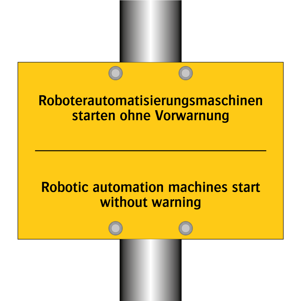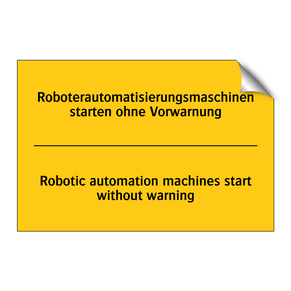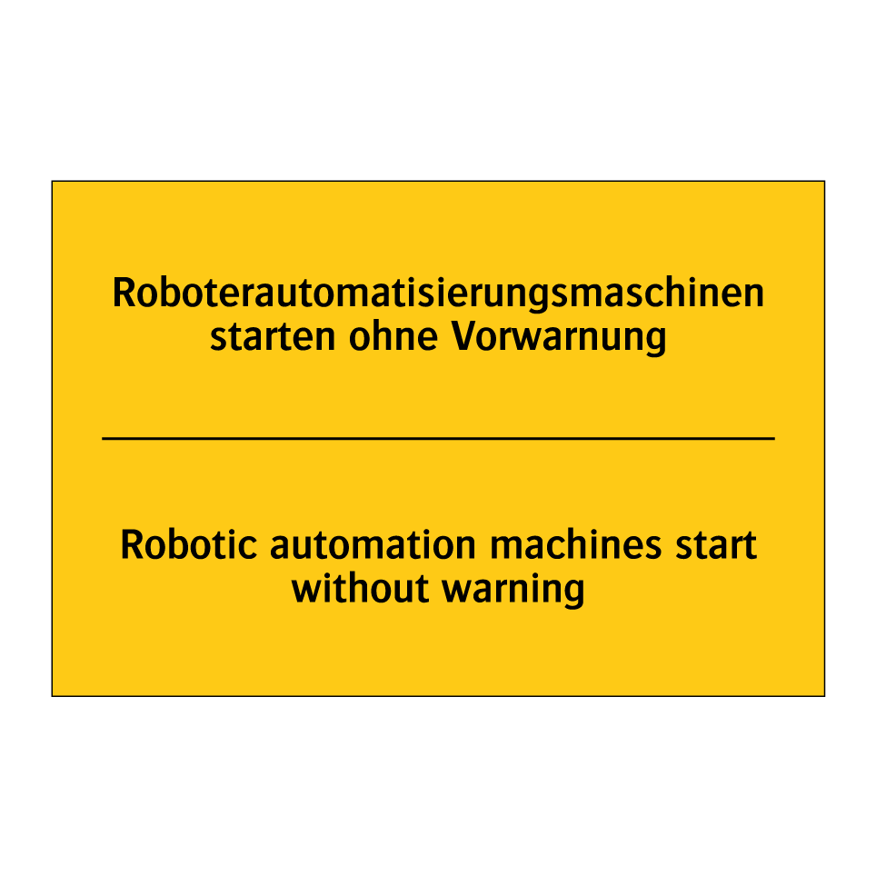 Diese zweisprachige Warnschild mit gelbem Hintergrund und schwarzem Text ist ideal für den Einsatz in industriellen Umgebungen, in denen Roboterautomatisierungsmaschinen ohne Vorwarnung starten können. Die Kombination aus deutscher und englischer Sprache auf der Warnschilder sorgt dafür, dass sowohl lokale als auch internationale Mitarbeiter die wichtige Sicherheitsbotschaft verstehen. Platzieren Sie diese Warnschild in Produktionshallen, Fabriken oder anderen Bereichen, in denen automatisierte Maschinen betrieben werden, um das Bewusstsein für potenzielle Gefahren zu erhöhen. Die klare und auffällige Gestaltung der Warnschild zieht die Aufmerksamkeit auf sich und trägt zur Vermeidung von Unfällen bei.