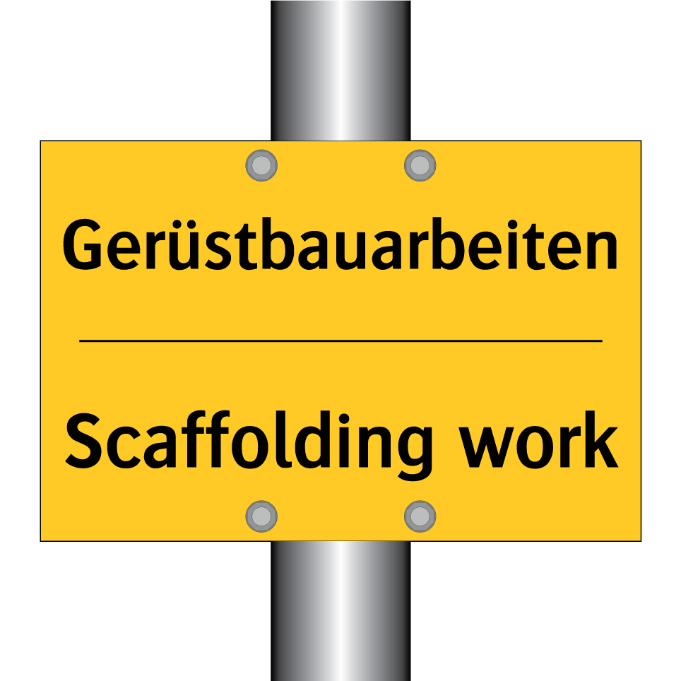 Zweisprachiges Warnschild mit deutschem Text Gerüstbauarbeiten und englischem Text Scaffolding work