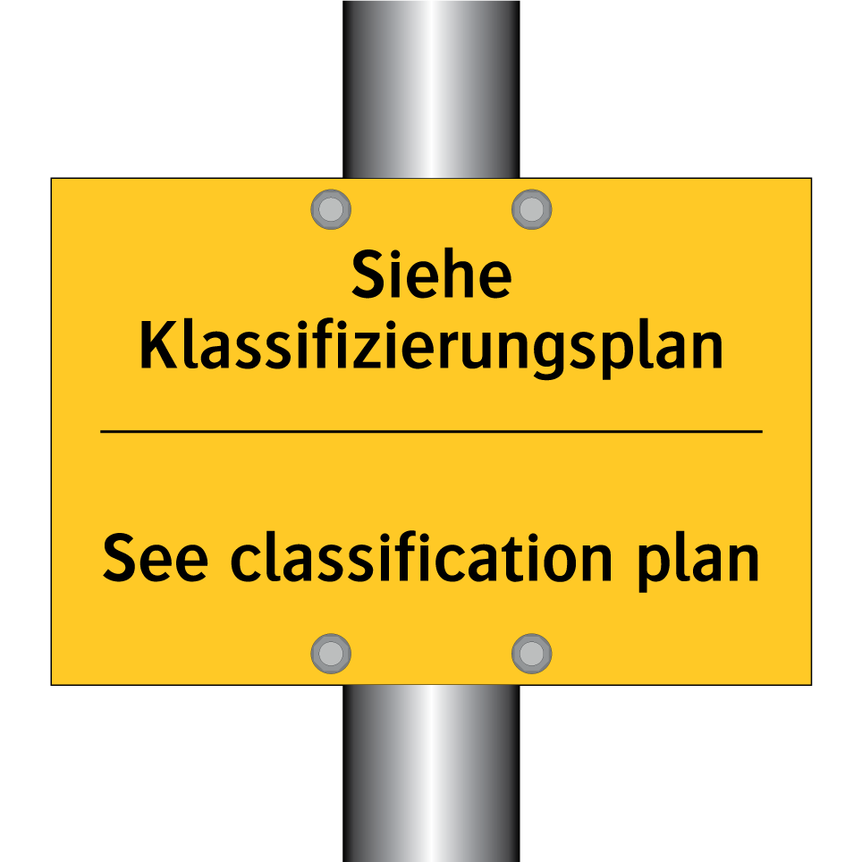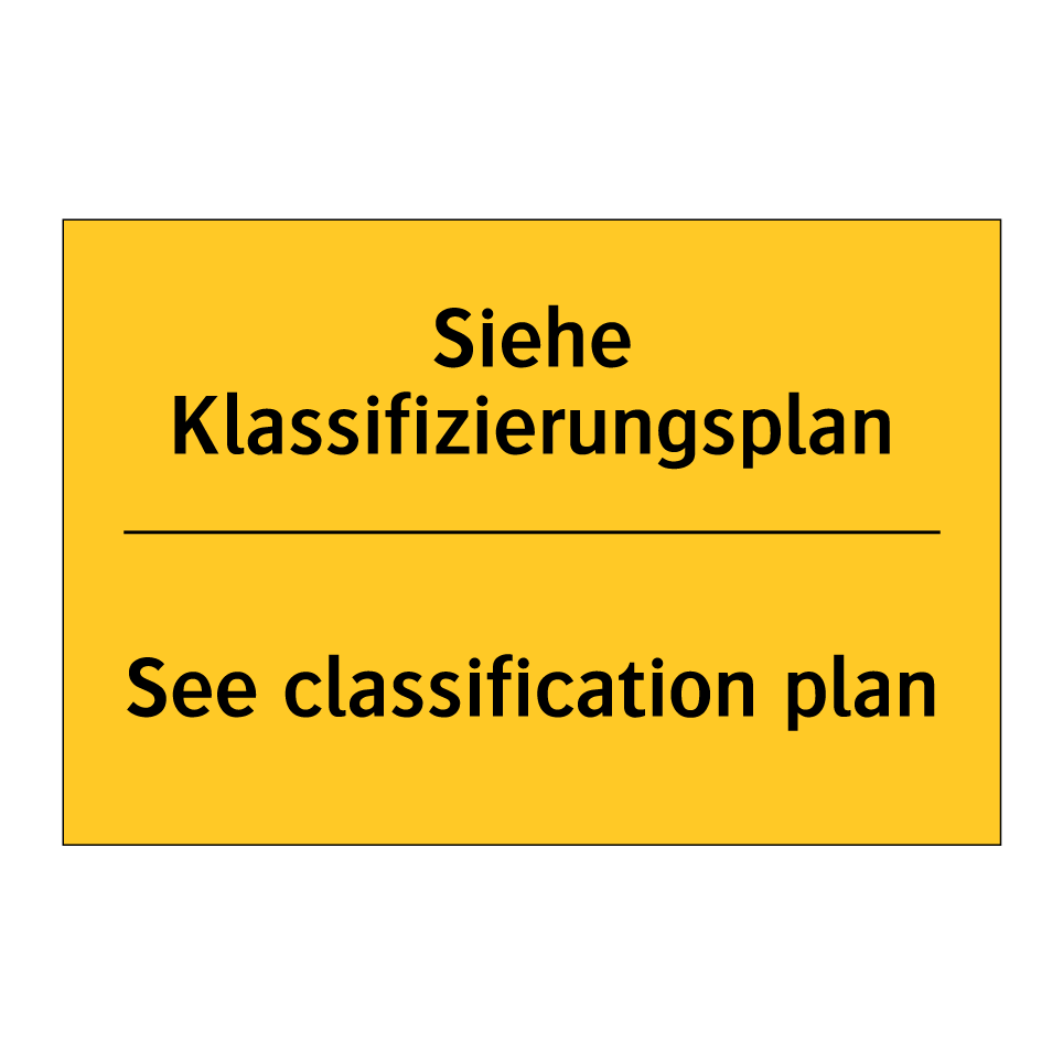 Zweisprachiges Warnschild mit deutschem Text Siehe Klassifizierungsplan und englischem Text See classification plan