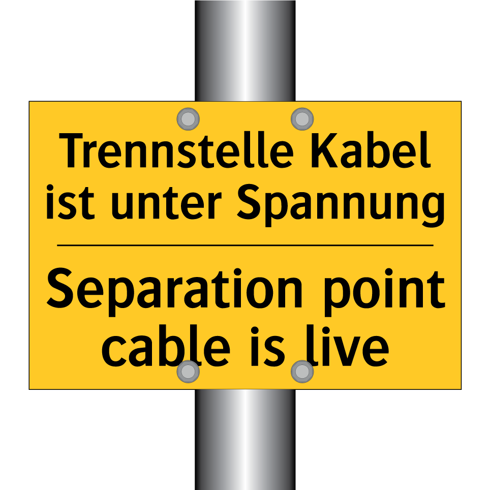 Zweisprachiges Warnschild mit deutschem Text Trennstelle Kabel ist unter Spannung und englischem Text Separation point cable is live