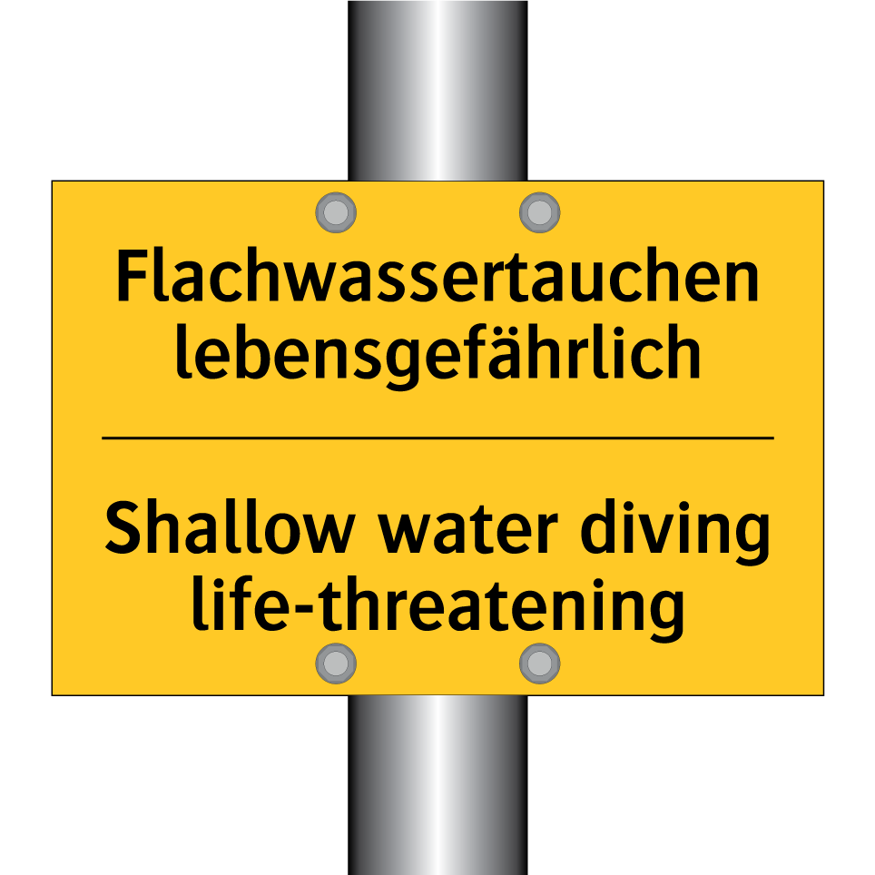 Zweisprachiges Warnschild mit deutschem Text Flachwassertauchen lebensgefährlich und englischem Text Shallow water diving life-threatening