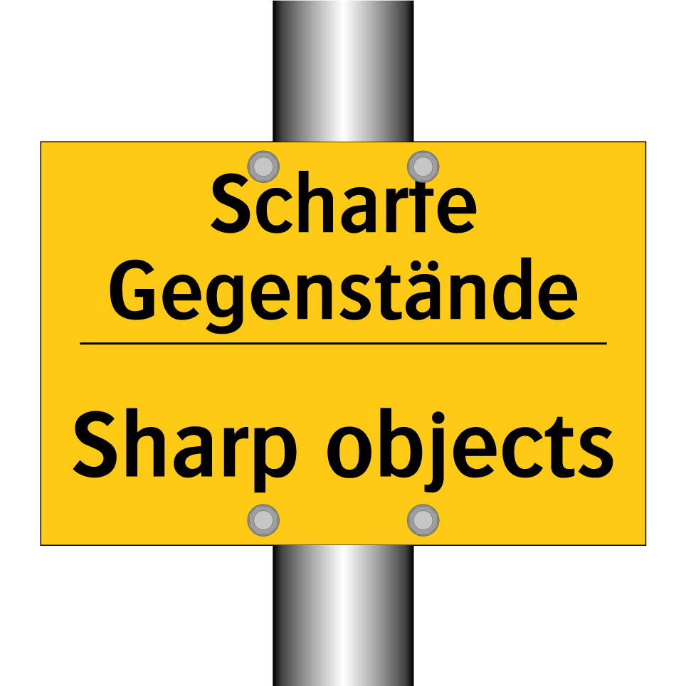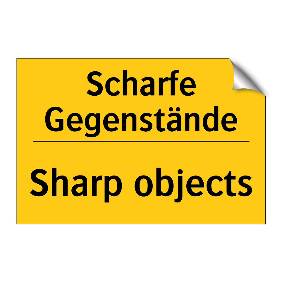 Zweisprachiges Warnschild mit deutschem Text Scharfe Gegenstände und englischem Text Sharp objects