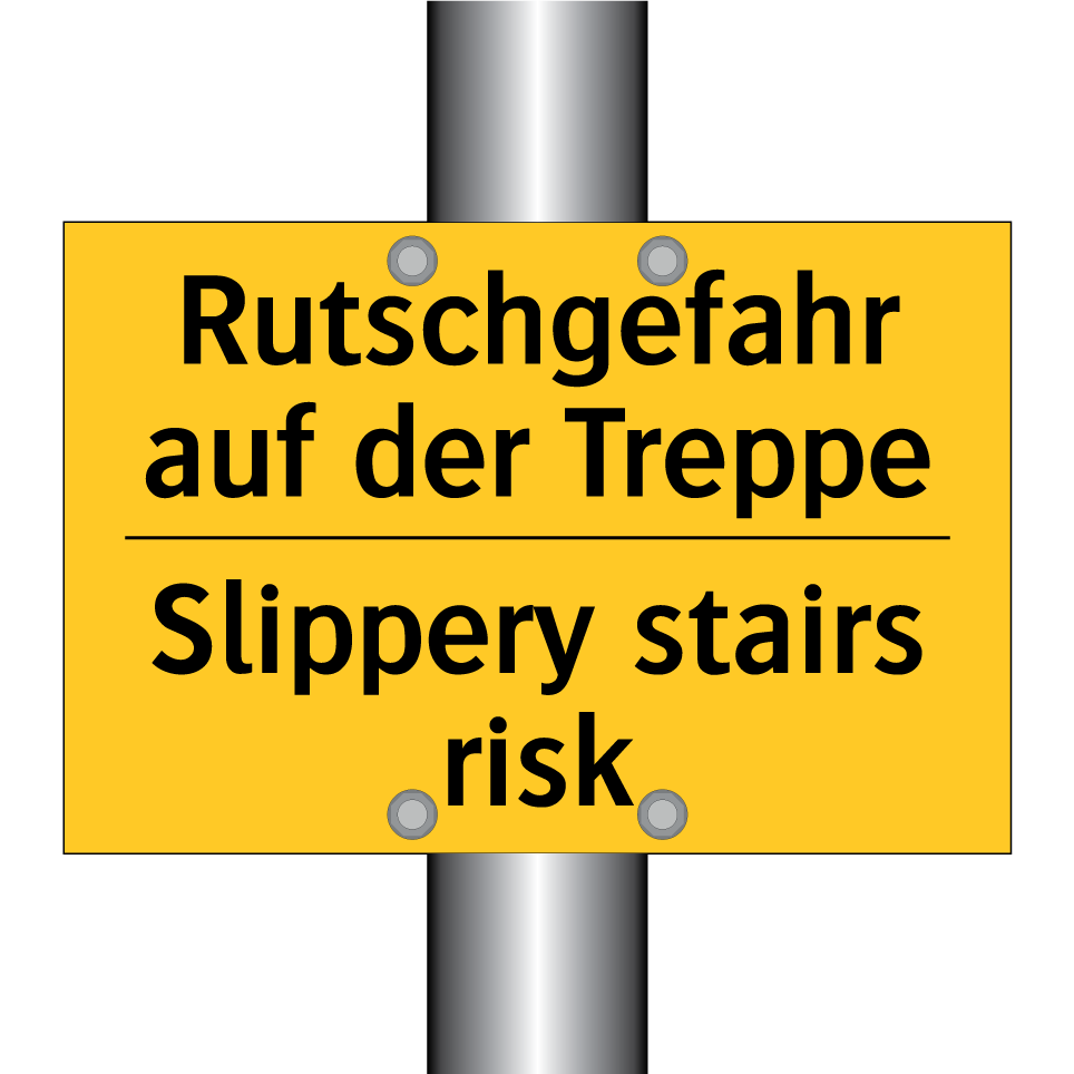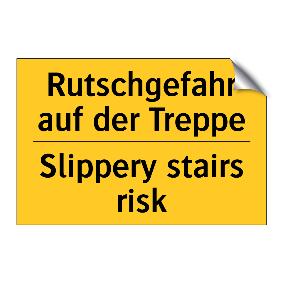 Zweisprachiges Warnschild mit deutschem Text Rutschgefahr auf der Treppe und englischem Text Slippery stairs risk