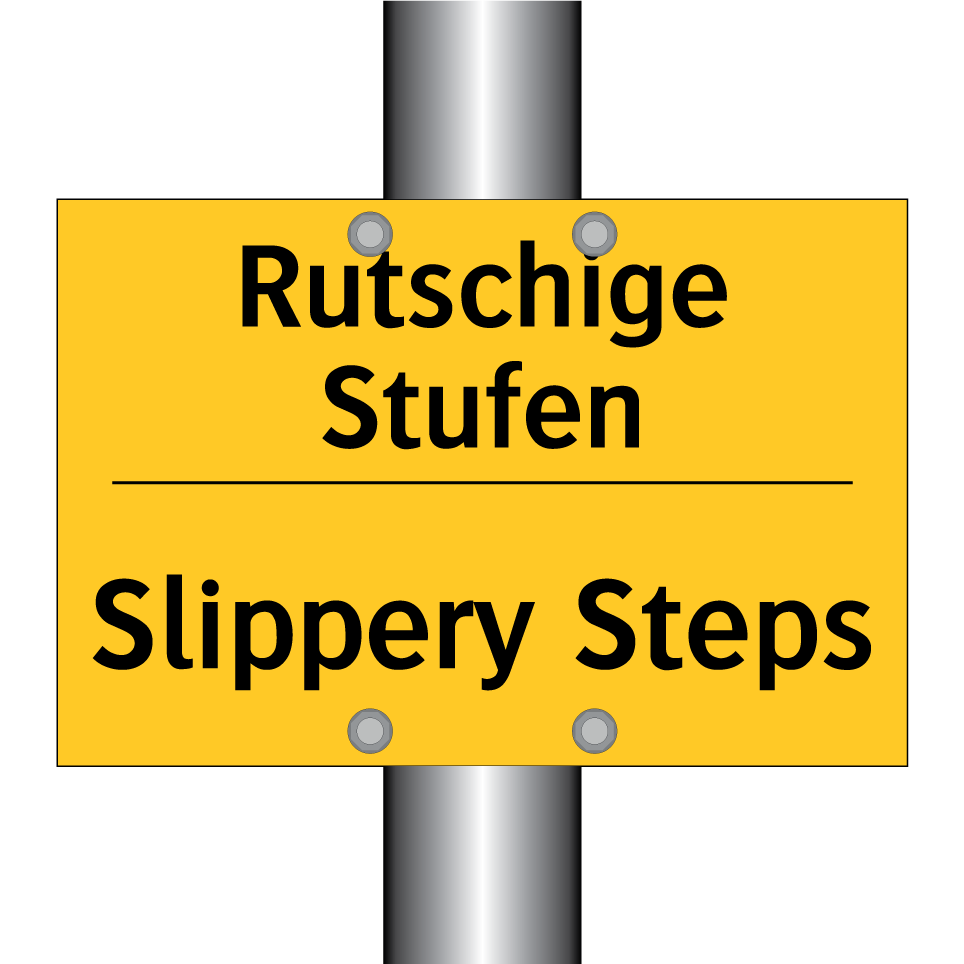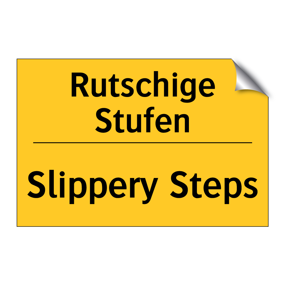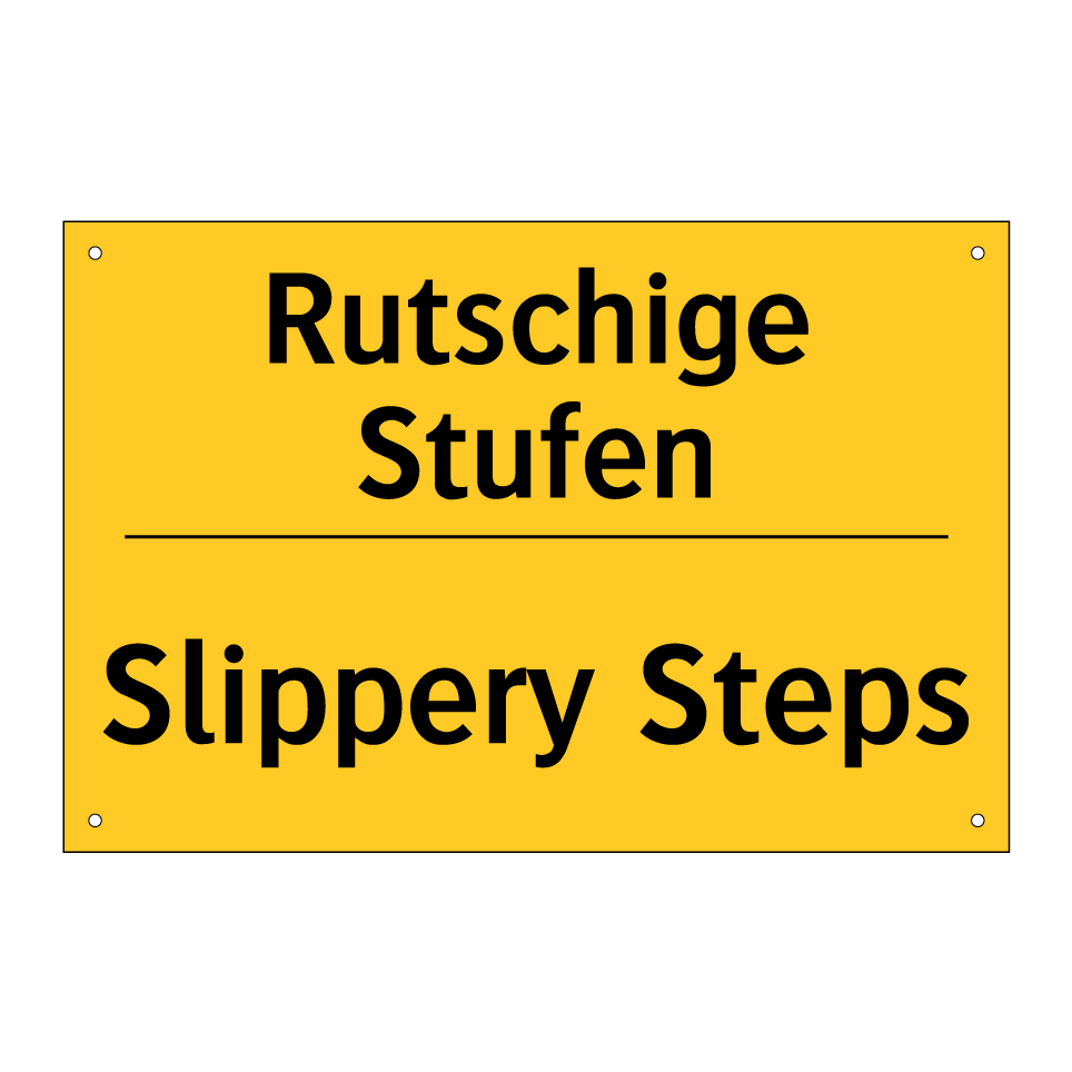 Zweisprachiges Warnschild mit deutschem Text Rutschige Stufen und englischem Text Slippery Steps