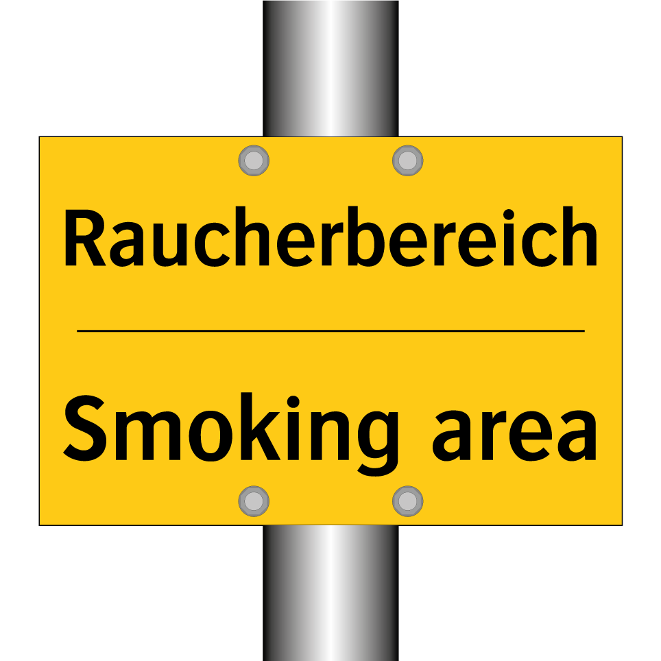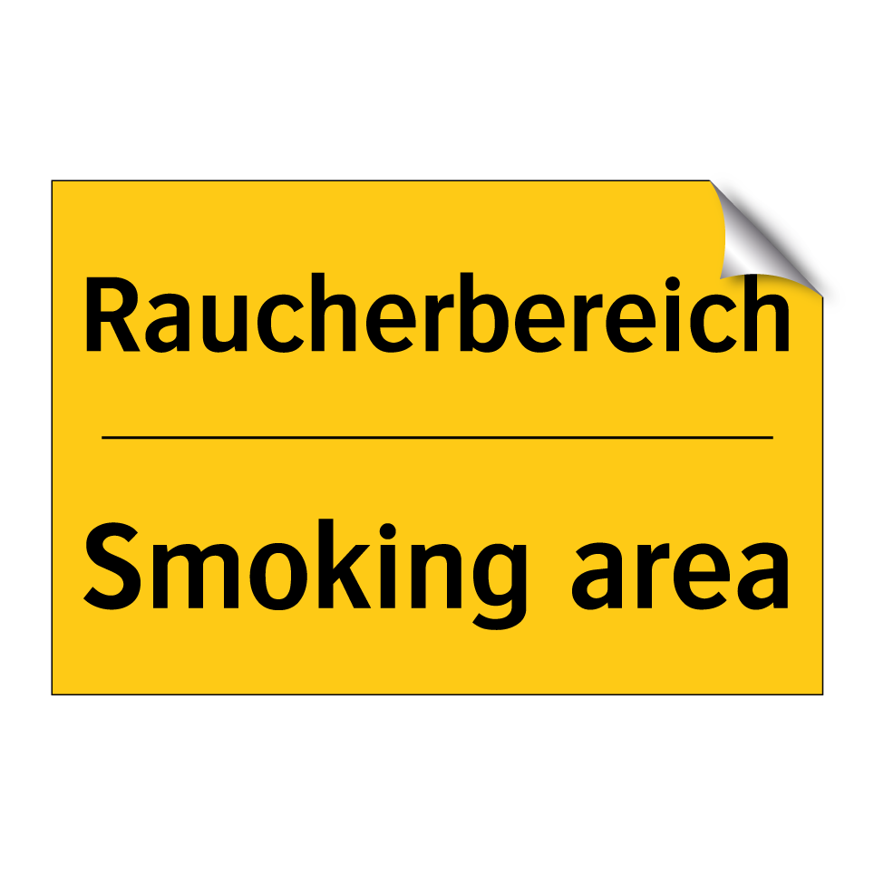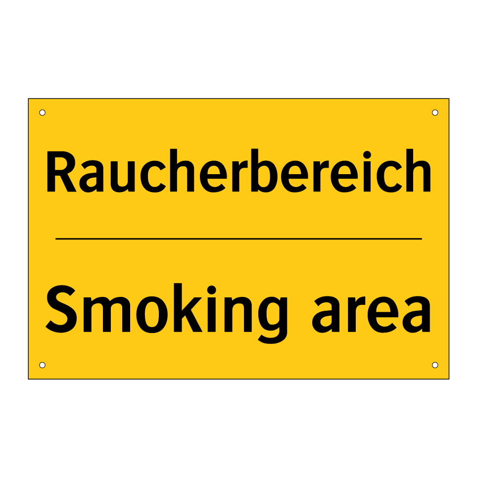 Zweisprachiges Warnschild mit deutschem Text Raucherbereich und englischem Text Smoking area