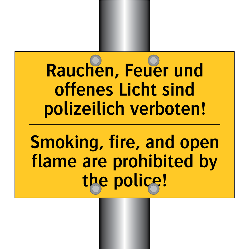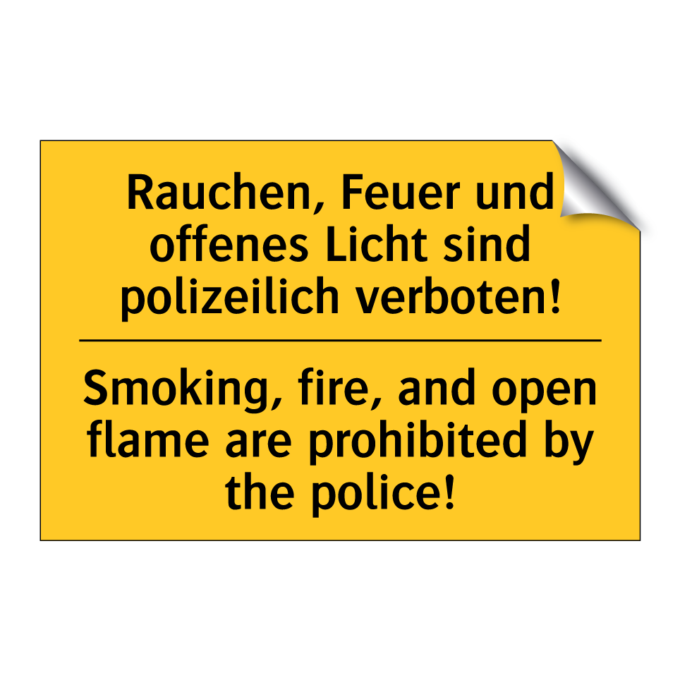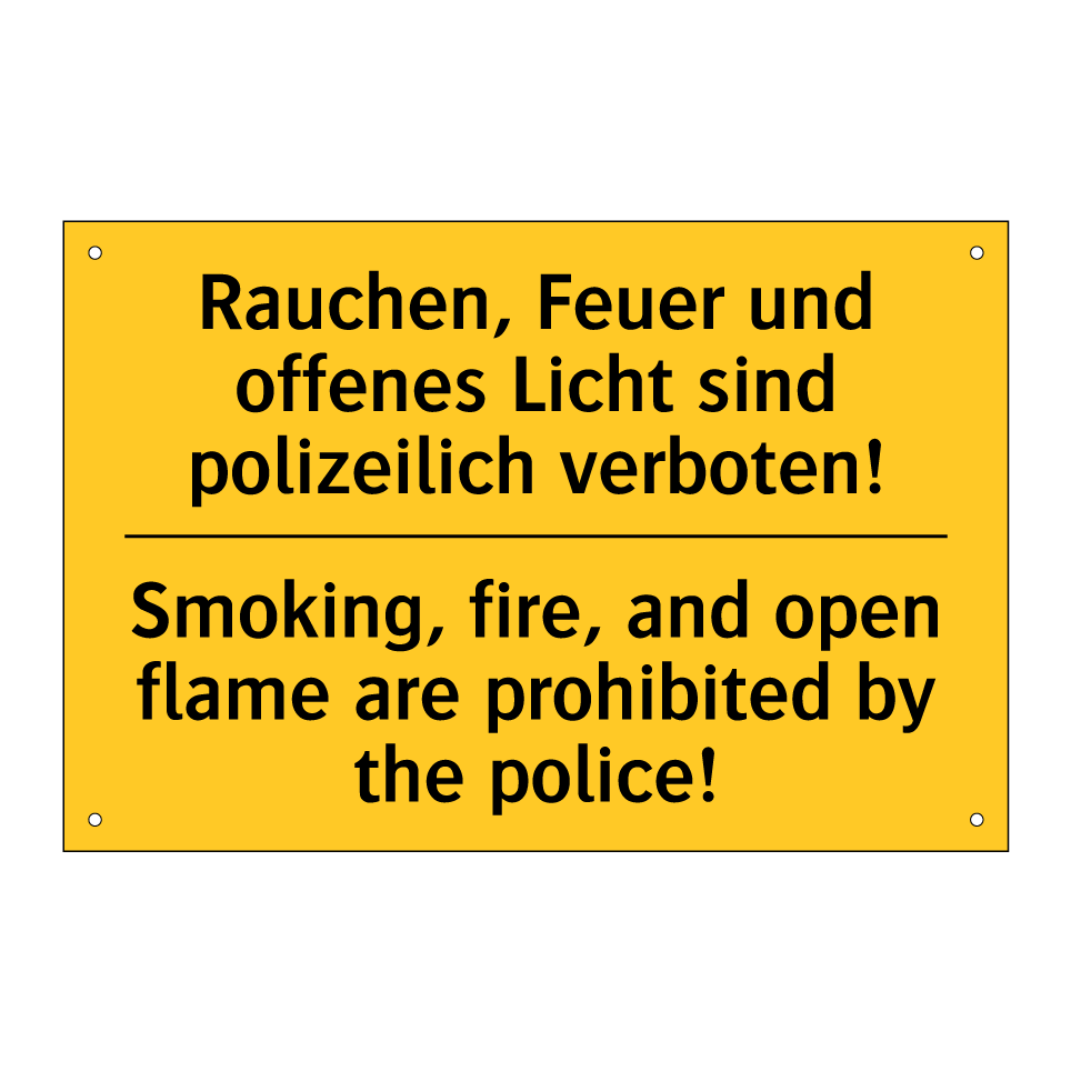 Zweisprachiges Warnschild mit deutschem Text Rauchen, Feuer und offenes Licht sind polizeilich verboten! und englischem Text Smoking, fire, and open flame are prohibited by the police!
