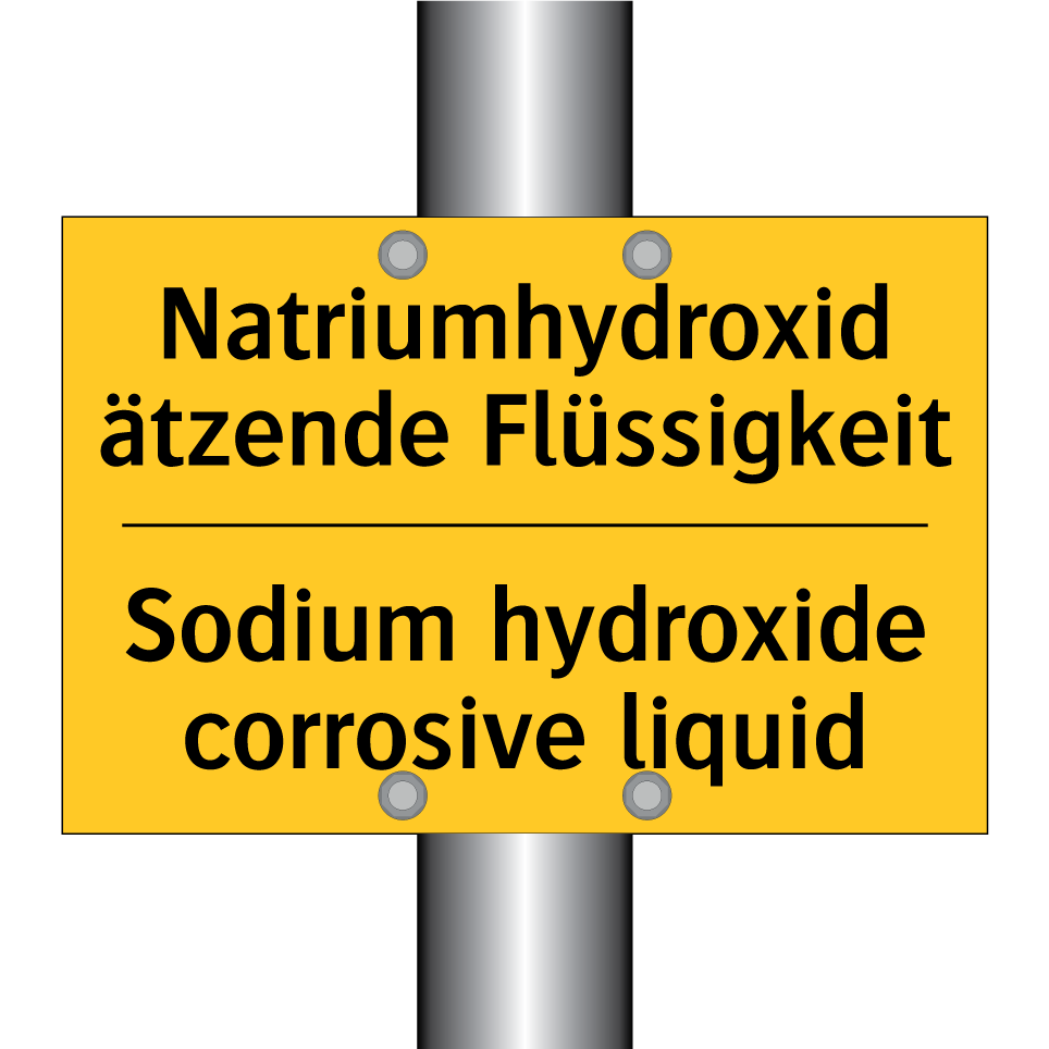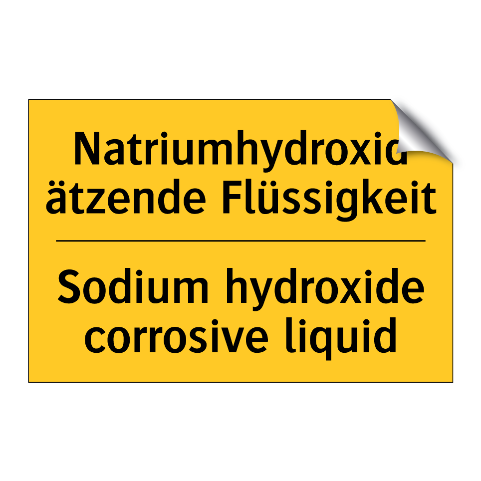 Zweisprachiges Warnschild mit deutschem Text Natriumhydroxid ätzende Flüssigkeit und englischem Text Sodium hydroxide corrosive liquid
