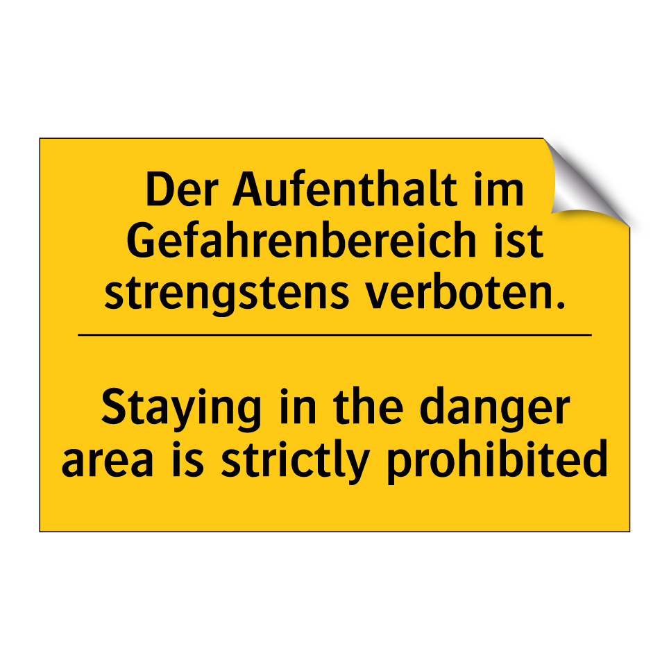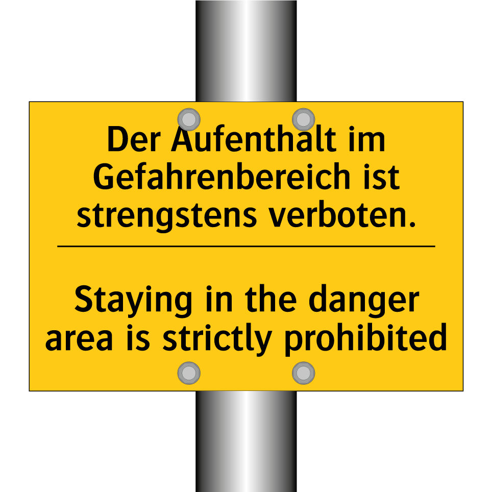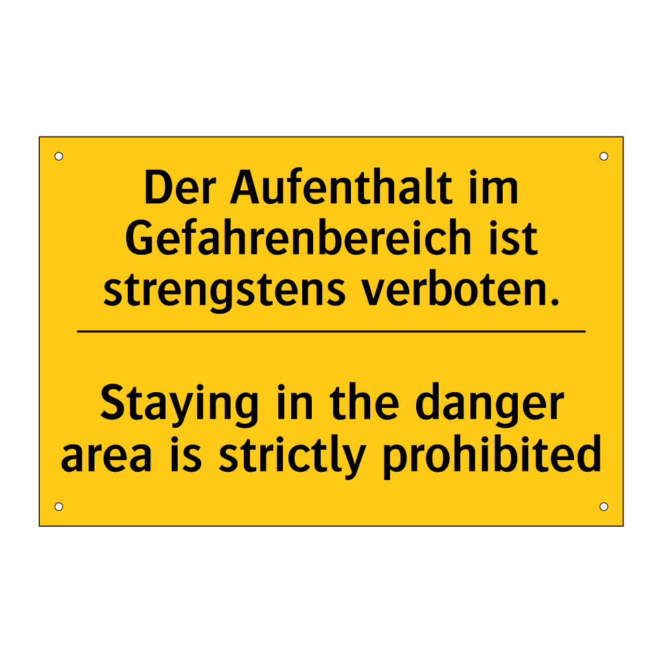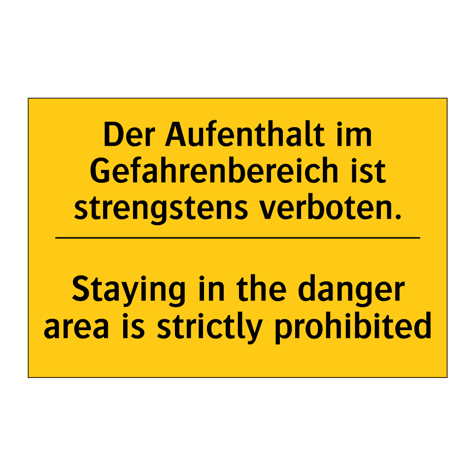 Zweisprachiges Warnschild mit deutschem Text Der Aufenthalt im Gefahrenbereich ist strengstens verboten. und englischem Text Staying in the danger area is strictly prohibited