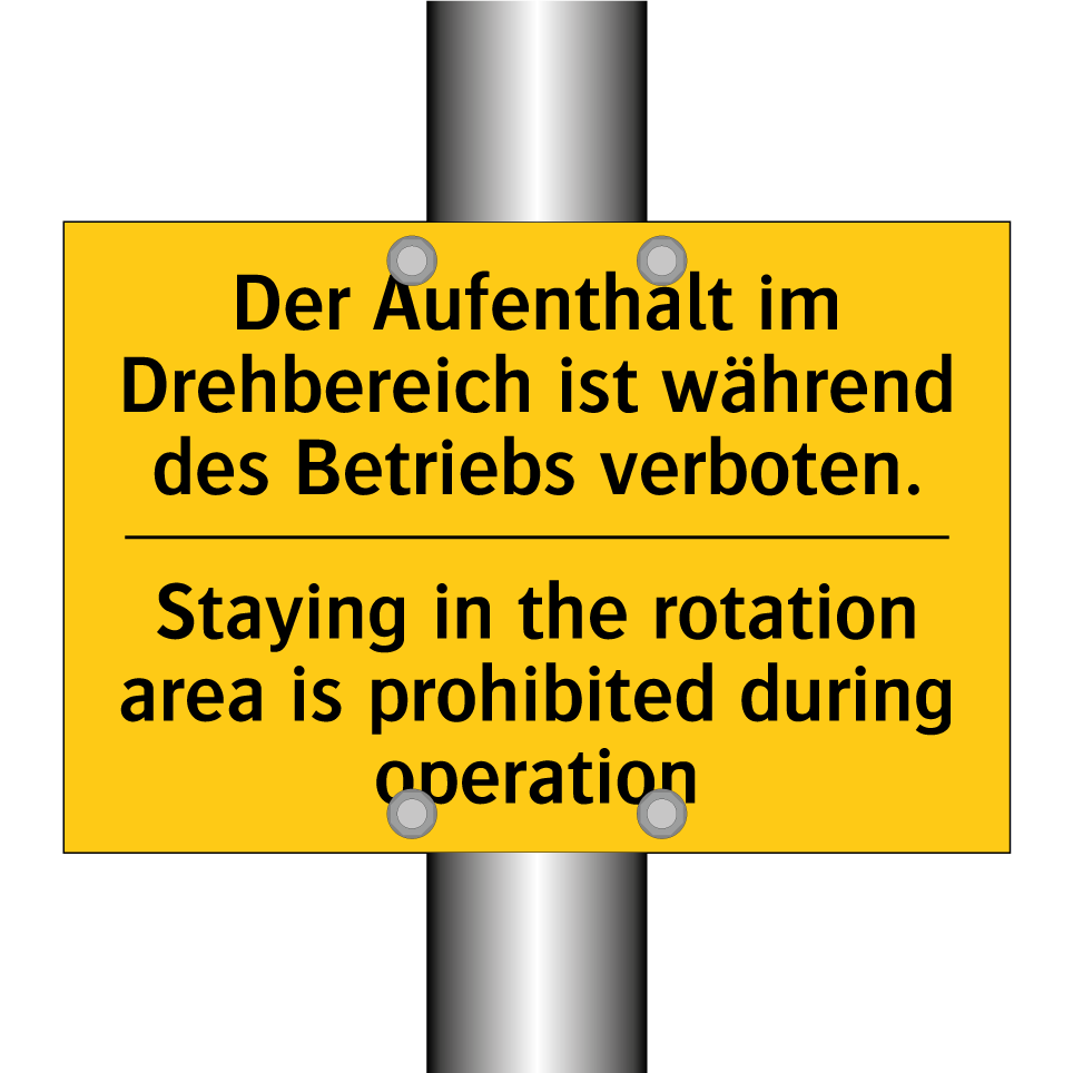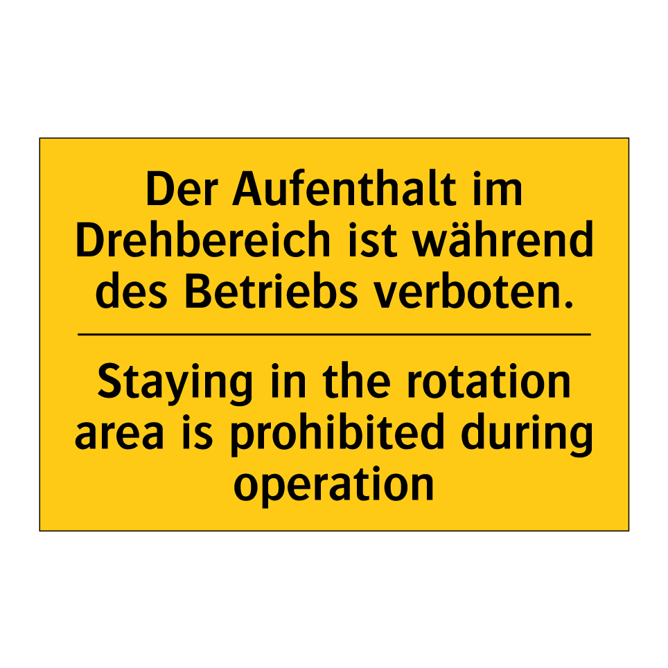 Zweisprachiges Warnschild mit deutschem Text Der Aufenthalt im Drehbereich ist während des Betriebs verboten. und englischem Text Staying in the rotation area is prohibited during operation
