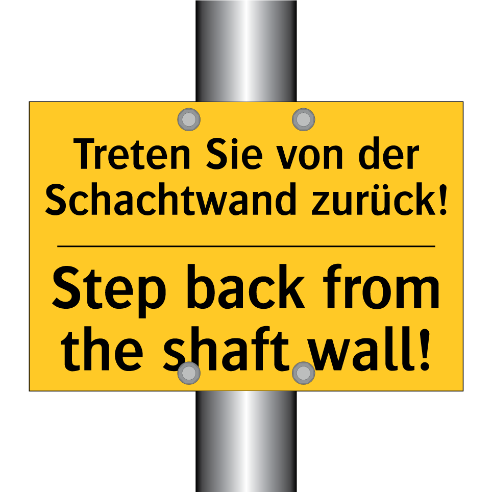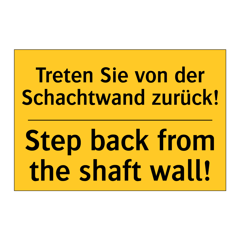 Zweisprachiges Warnschild mit deutschem Text Treten Sie von der Schachtwand zurück! und englischem Text Step back from the shaft wall!