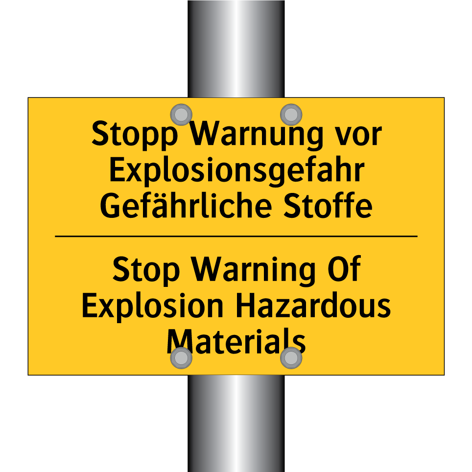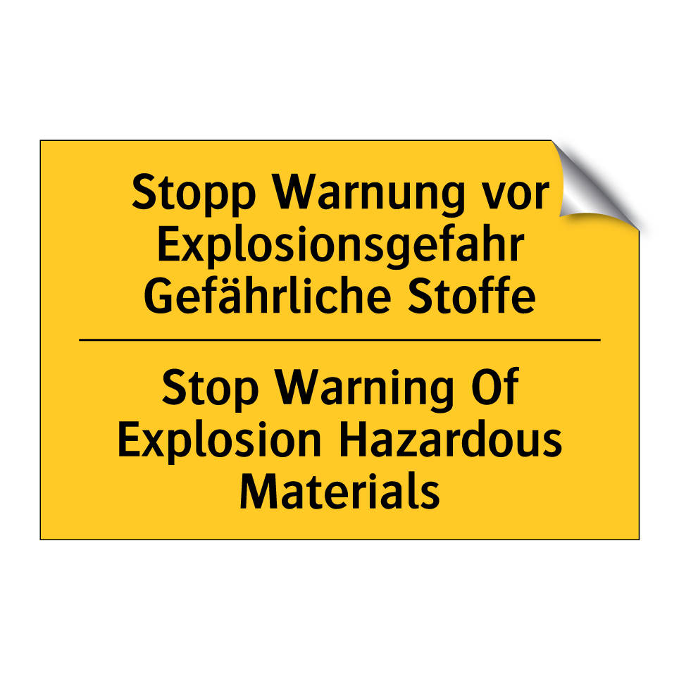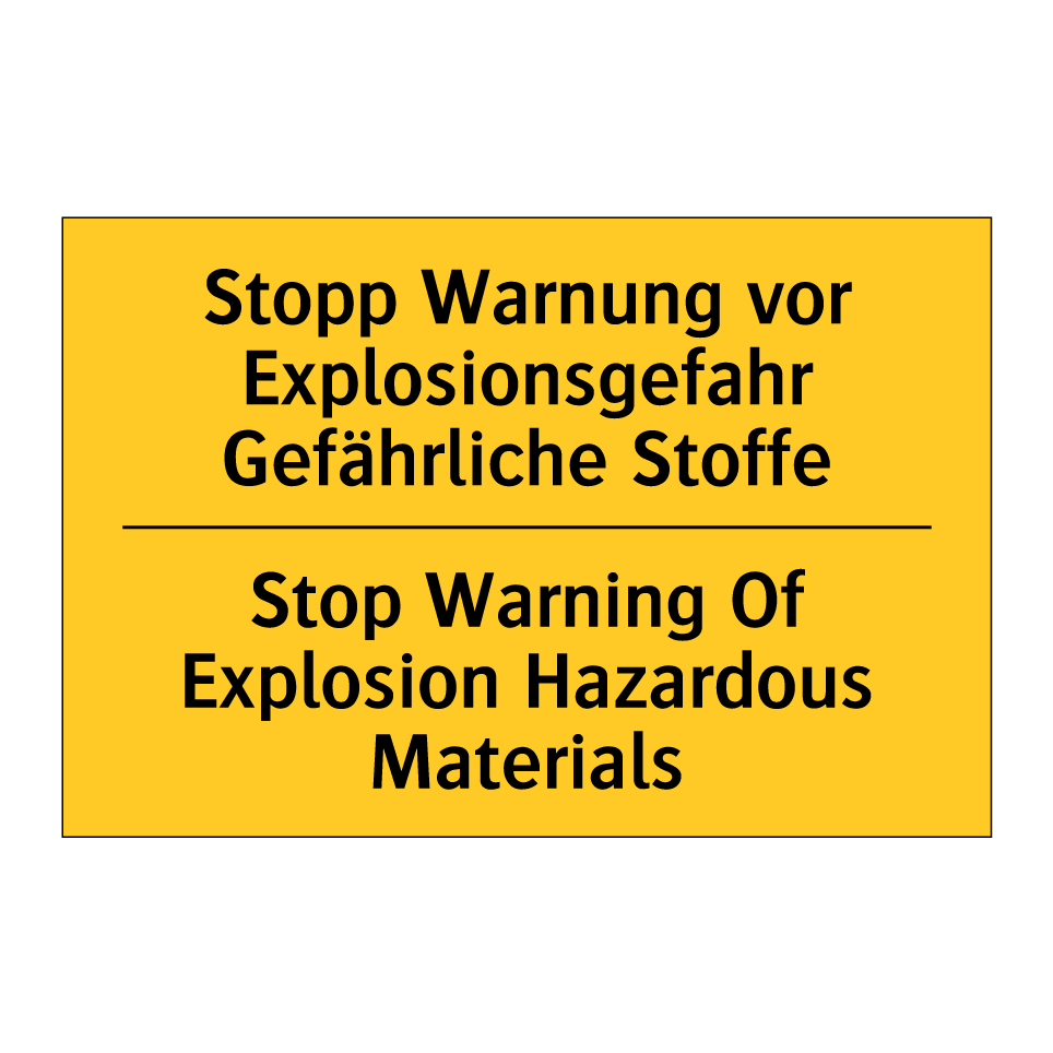 Zweisprachiges Warnschild mit deutschem Text Stopp Warnung vor Explosionsgefahr Gefährliche Stoffe und englischem Text Stop Warning Of Explosion Hazardous Materials