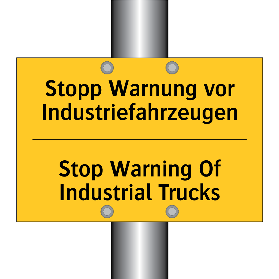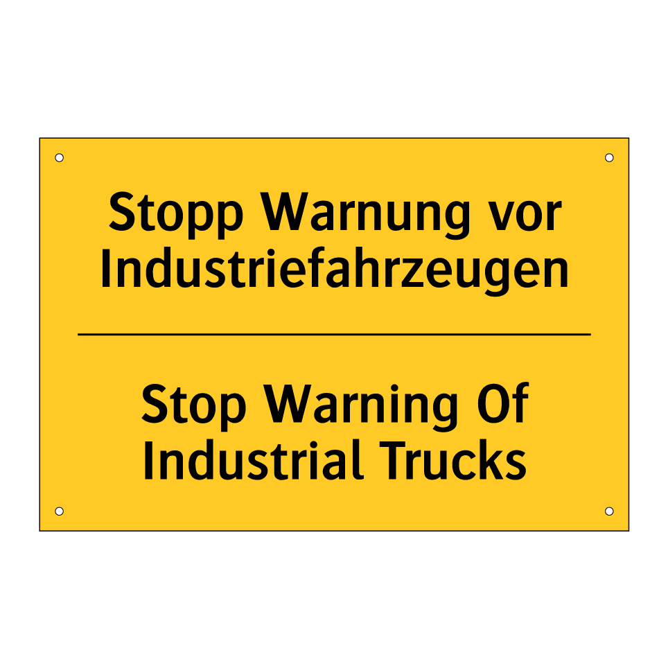 Zweisprachiges Warnschild mit deutschem Text Stopp Warnung vor Industriefahrzeugen und englischem Text Stop Warning Of Industrial Trucks