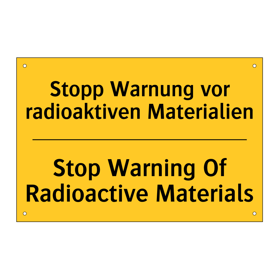 Zweisprachiges Warnschild mit deutschem Text Stopp Warnung vor radioaktiven Materialien und englischem Text Stop Warning Of Radioactive Materials