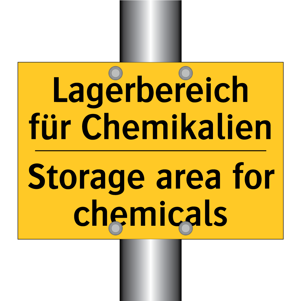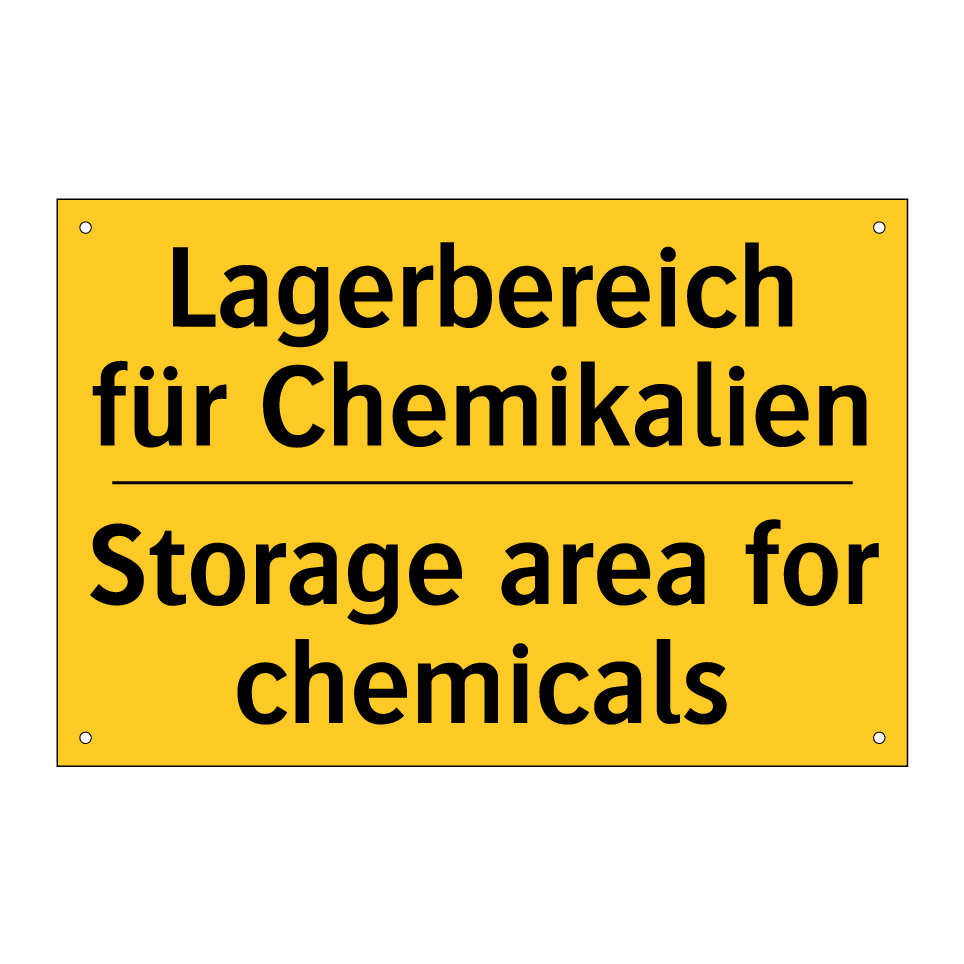 Zweisprachiges Warnschild mit deutschem Text Lagerbereich für Chemikalien und englischem Text Storage area for chemicals