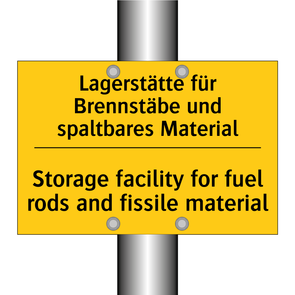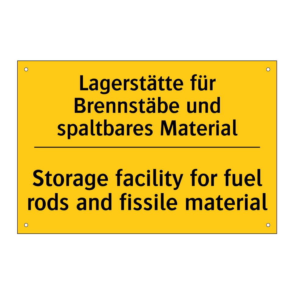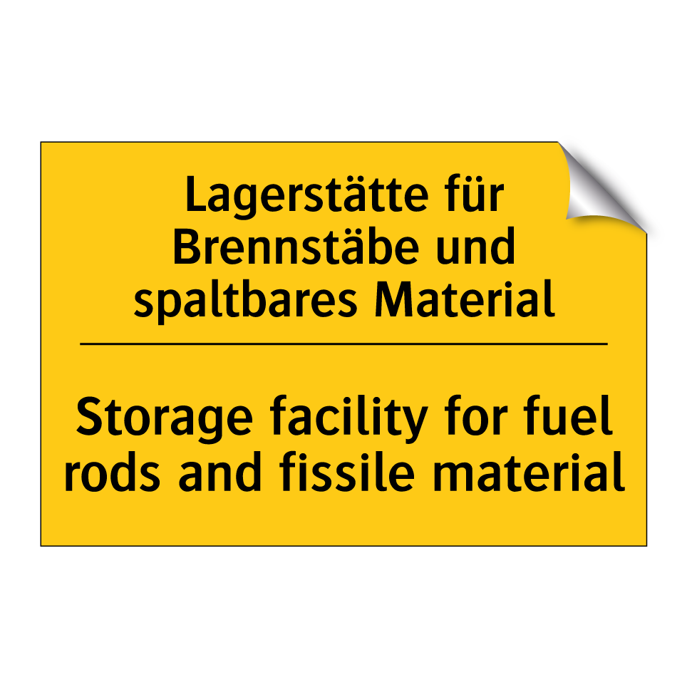 Zweisprachiges Warnschild mit deutschem Text Lagerstätte für Brennstäbe und spaltbares Material und englischem Text Storage facility for fuel rods and fissile material