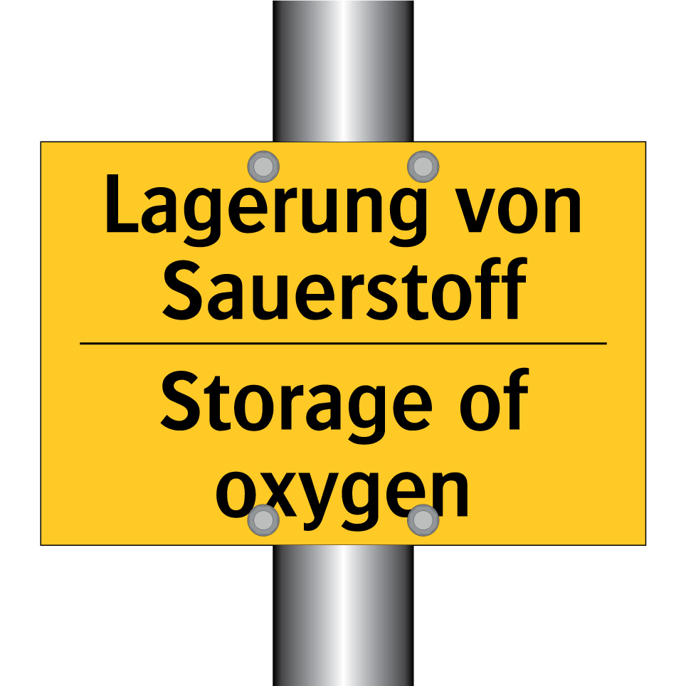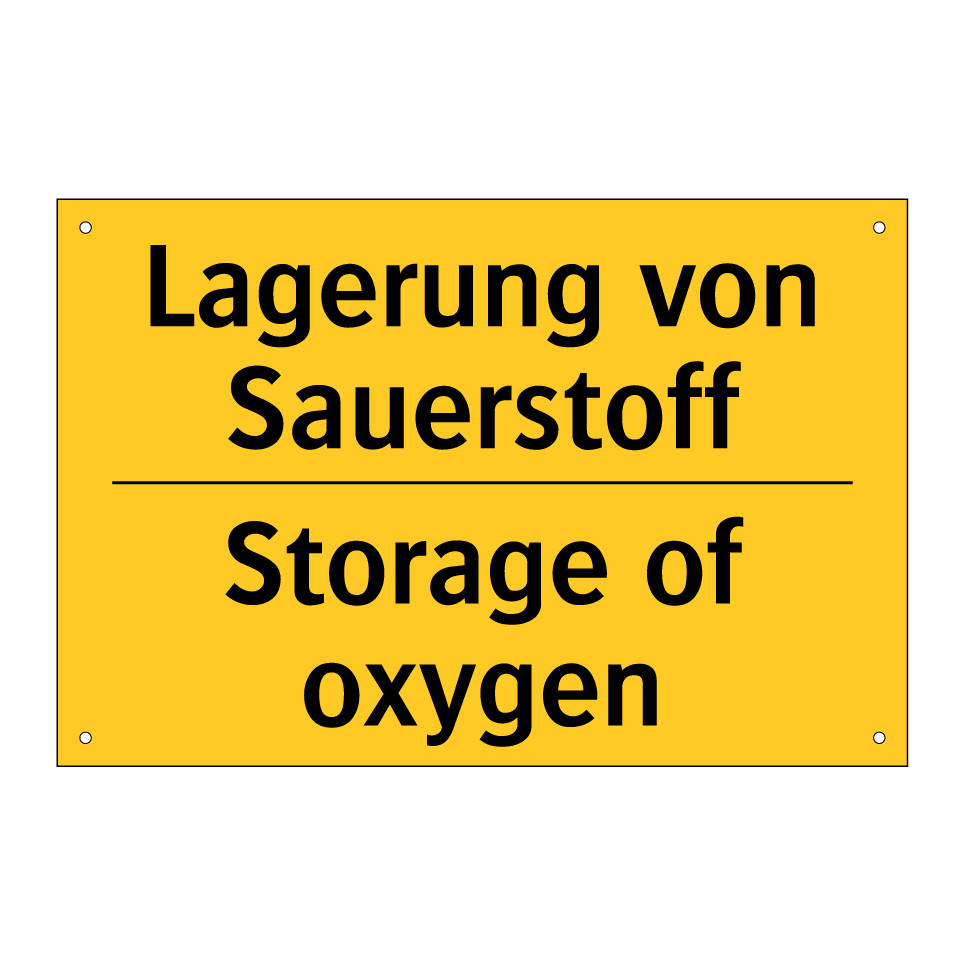 Zweisprachiges Warnschild mit deutschem Text Lagerung von Sauerstoff und englischem Text Storage of oxygen