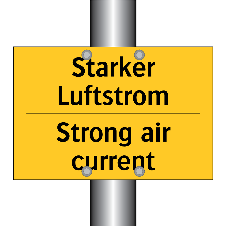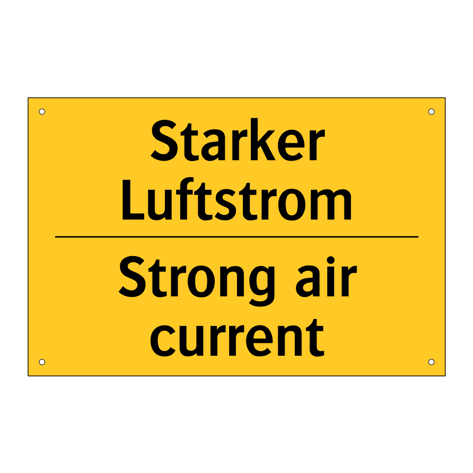 Zweisprachiges Warnschild mit deutschem Text Starker Luftstrom und englischem Text Strong air current