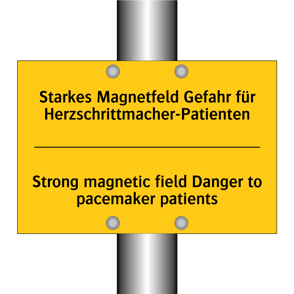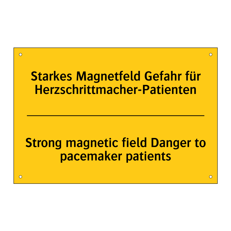Zweisprachiges Warnschild mit deutschem Text Starkes Magnetfeld Gefahr für Herzschrittmacher-Patienten und englischem Text Strong magnetic field Danger to pacemaker patients