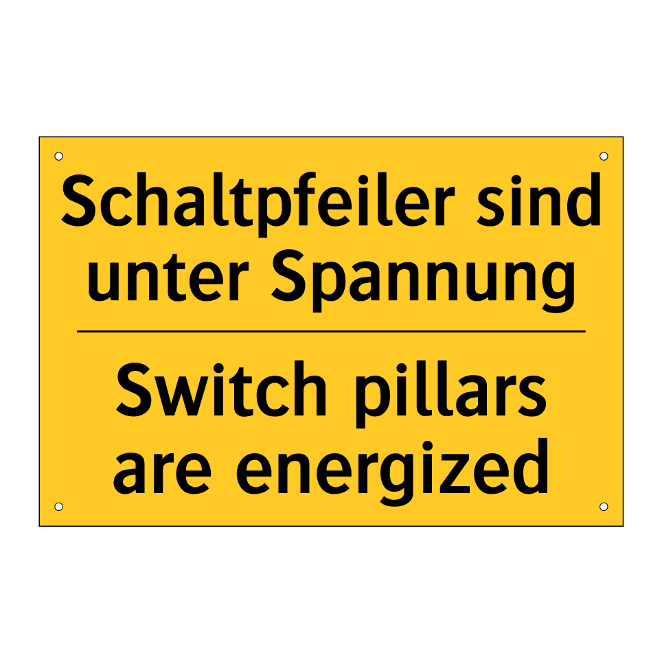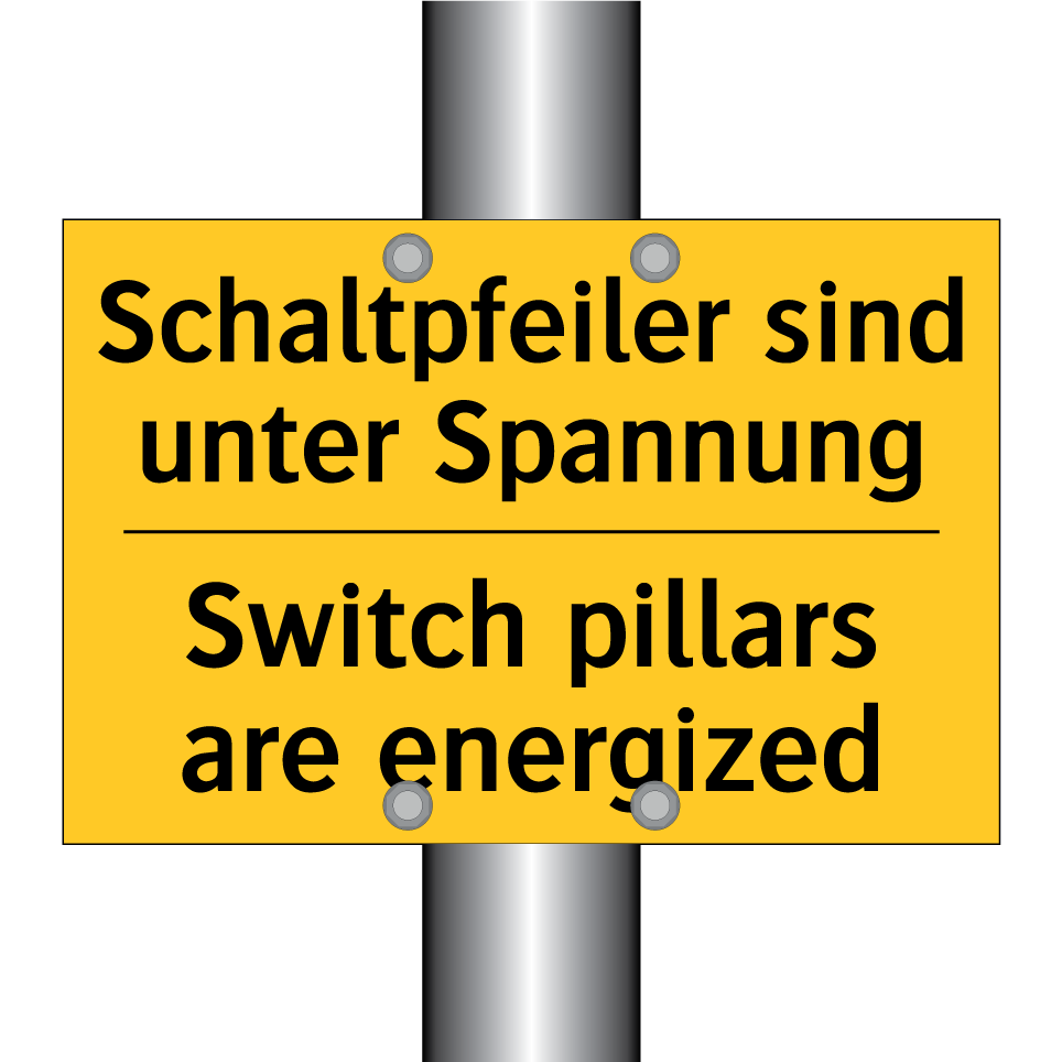 Zweisprachiges Warnschild mit deutschem Text Schaltpfeiler sind unter Spannung und englischem Text Switch pillars are energized