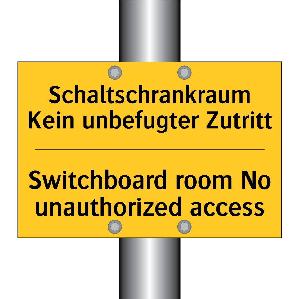 Zweisprachiges Warnschild mit deutschem Text Schaltschrankraum Kein unbefugter Zutritt und englischem Text Switchboard room No unauthorized access