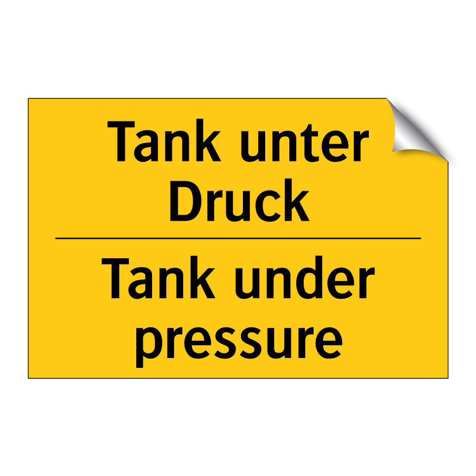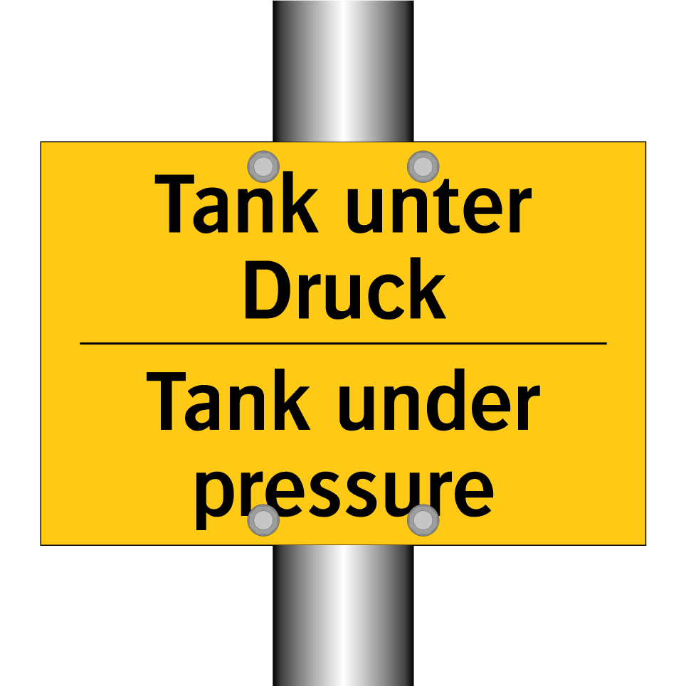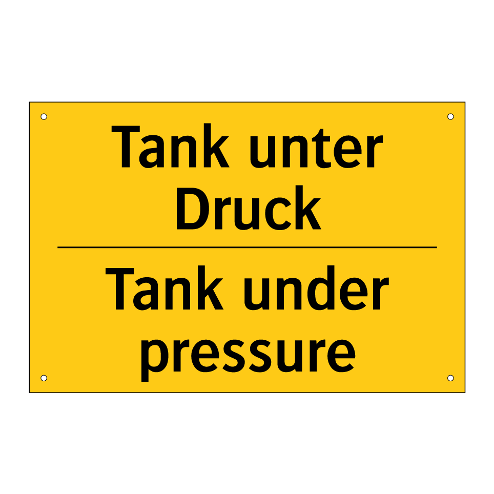 Zweisprachiges Warnschild mit deutschem Text Tank unter Druck und englischem Text Tank under pressure