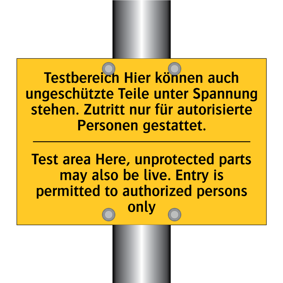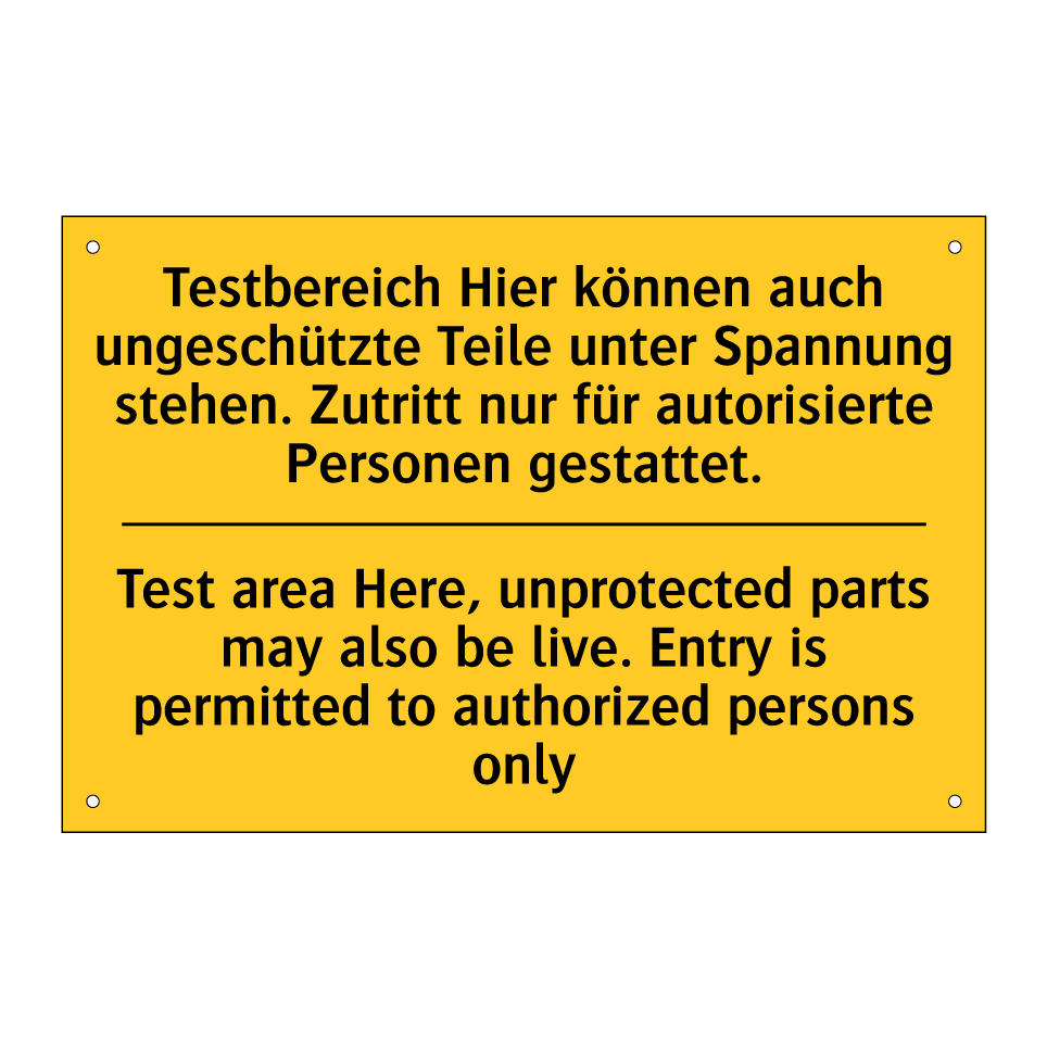 Zweisprachiges Warnschild mit deutschem Text Testbereich Hier können auch ungeschützte Teile unter Spannung stehen. Zutritt nur für autorisierte Personen gestattet. und englischem Text Test area Here, unprotected parts may also be live. Entry is permitted to authorized persons only