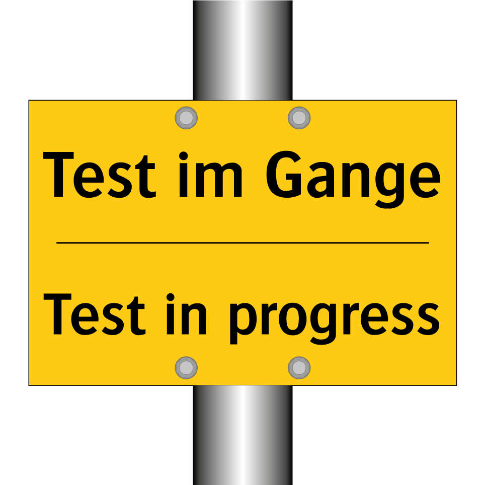 Zweisprachiges Warnschild mit deutschem Text Test im Gange und englischem Text Test in progress