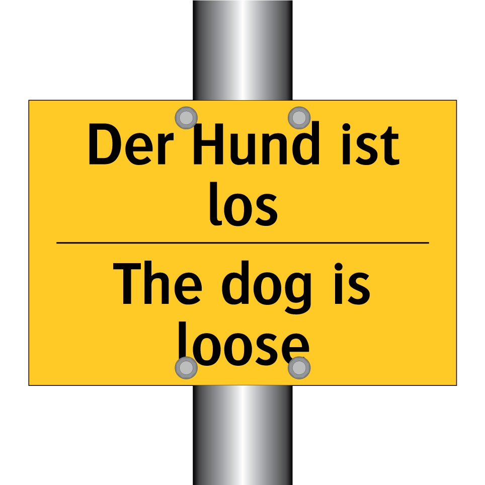 Zweisprachiges Warnschild mit deutschem Text Der Hund ist los und englischem Text The dog is loose