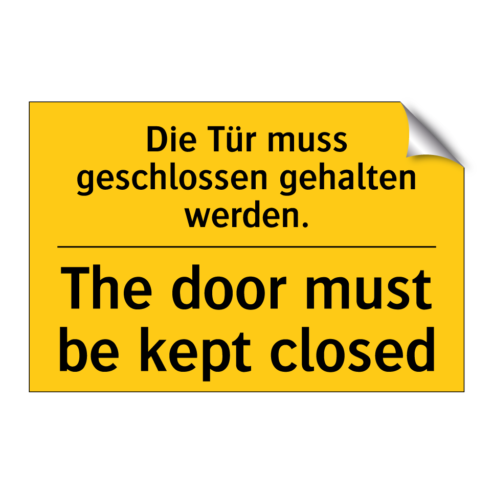 Zweisprachiges Warnschild mit deutschem Text Die Tür muss geschlossen gehalten werden. und englischem Text The door must be kept closed