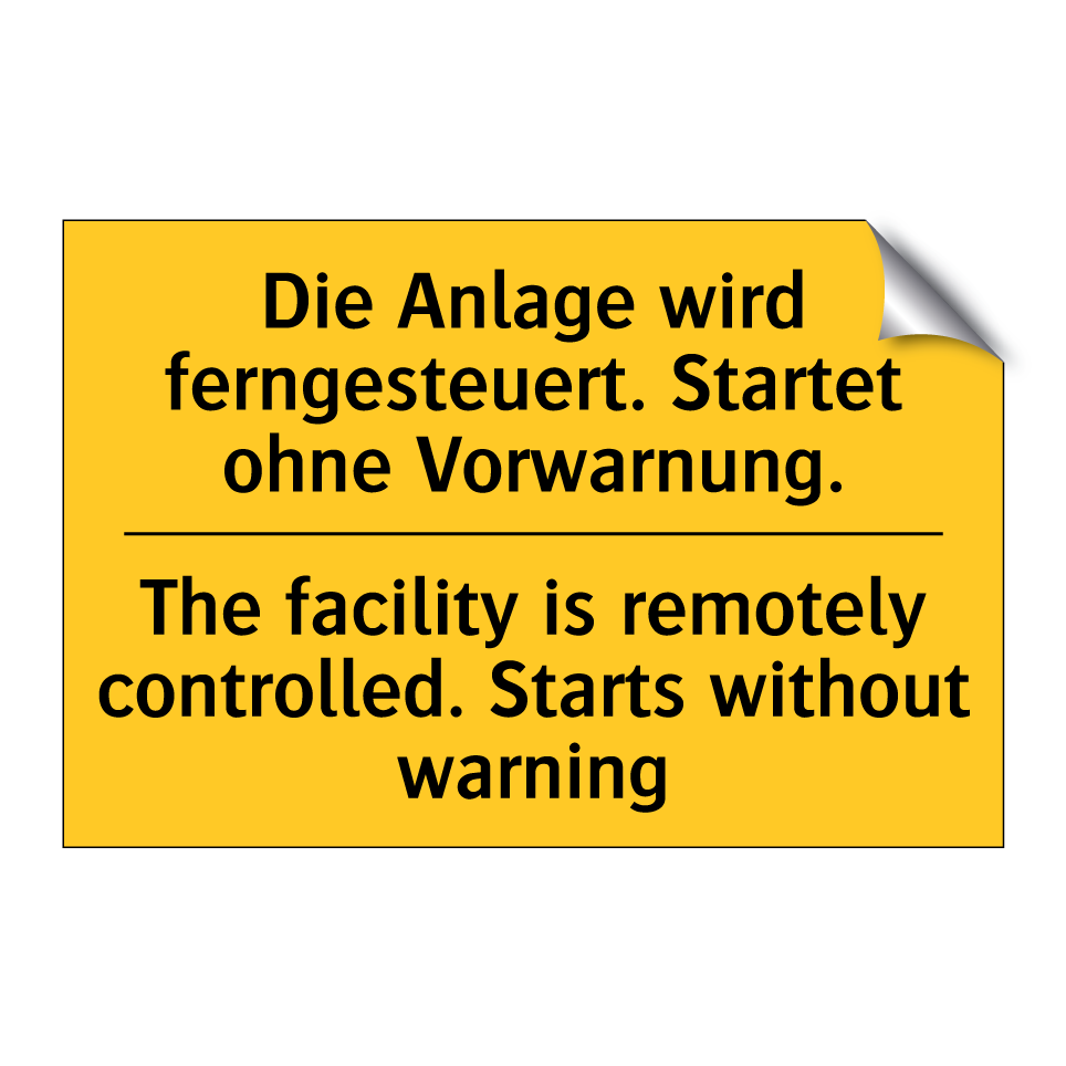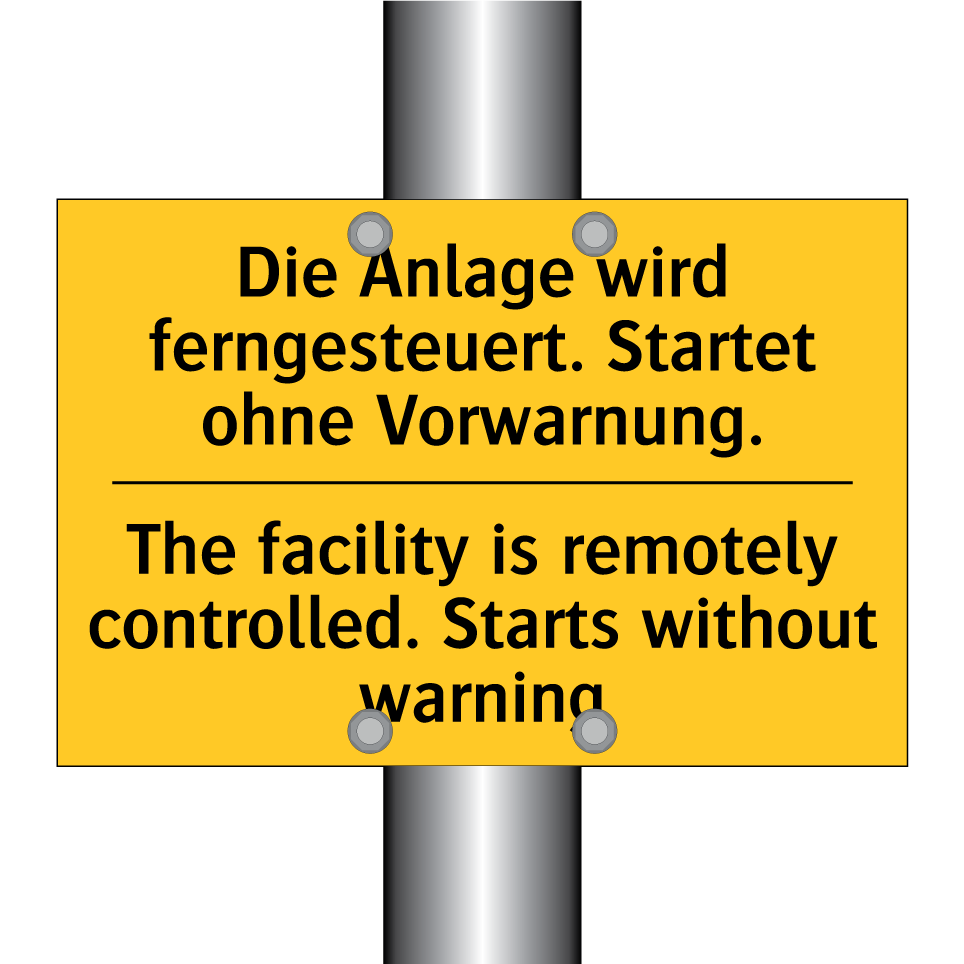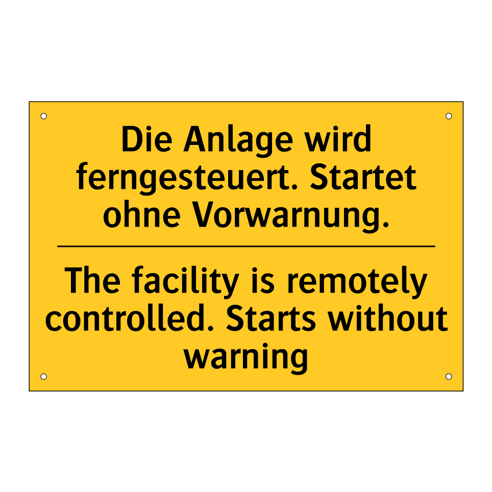 Zweisprachiges Warnschild mit deutschem Text Die Anlage wird ferngesteuert. Startet ohne Vorwarnung. und englischem Text The facility is remotely controlled. Starts without warning