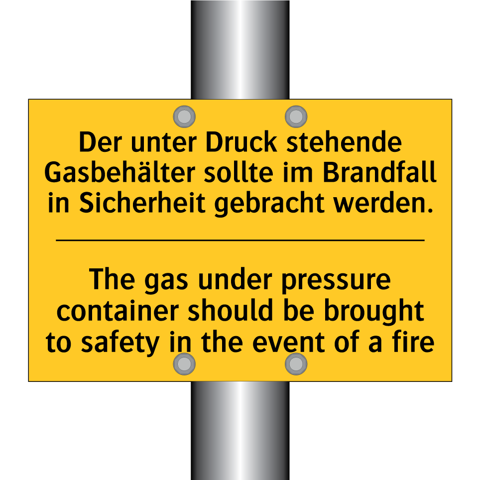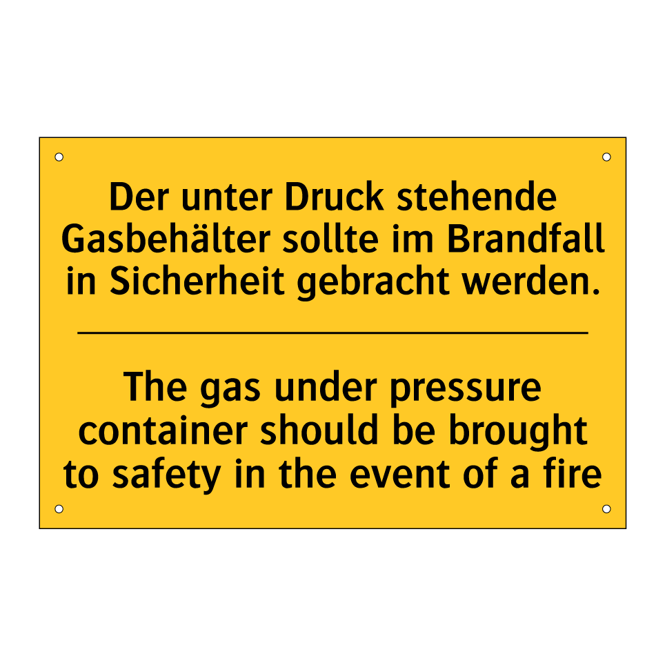 Zweisprachiges Warnschild mit deutschem Text Der unter Druck stehende Gasbehälter sollte im Brandfall in Sicherheit gebracht werden. und englischem Text The gas under pressure container should be brought to safety in the event of a fire
