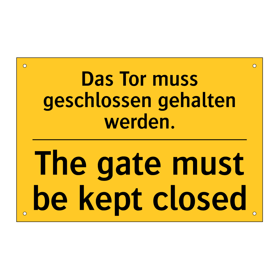 Zweisprachiges Warnschild mit deutschem Text Das Tor muss geschlossen gehalten werden. und englischem Text The gate must be kept closed